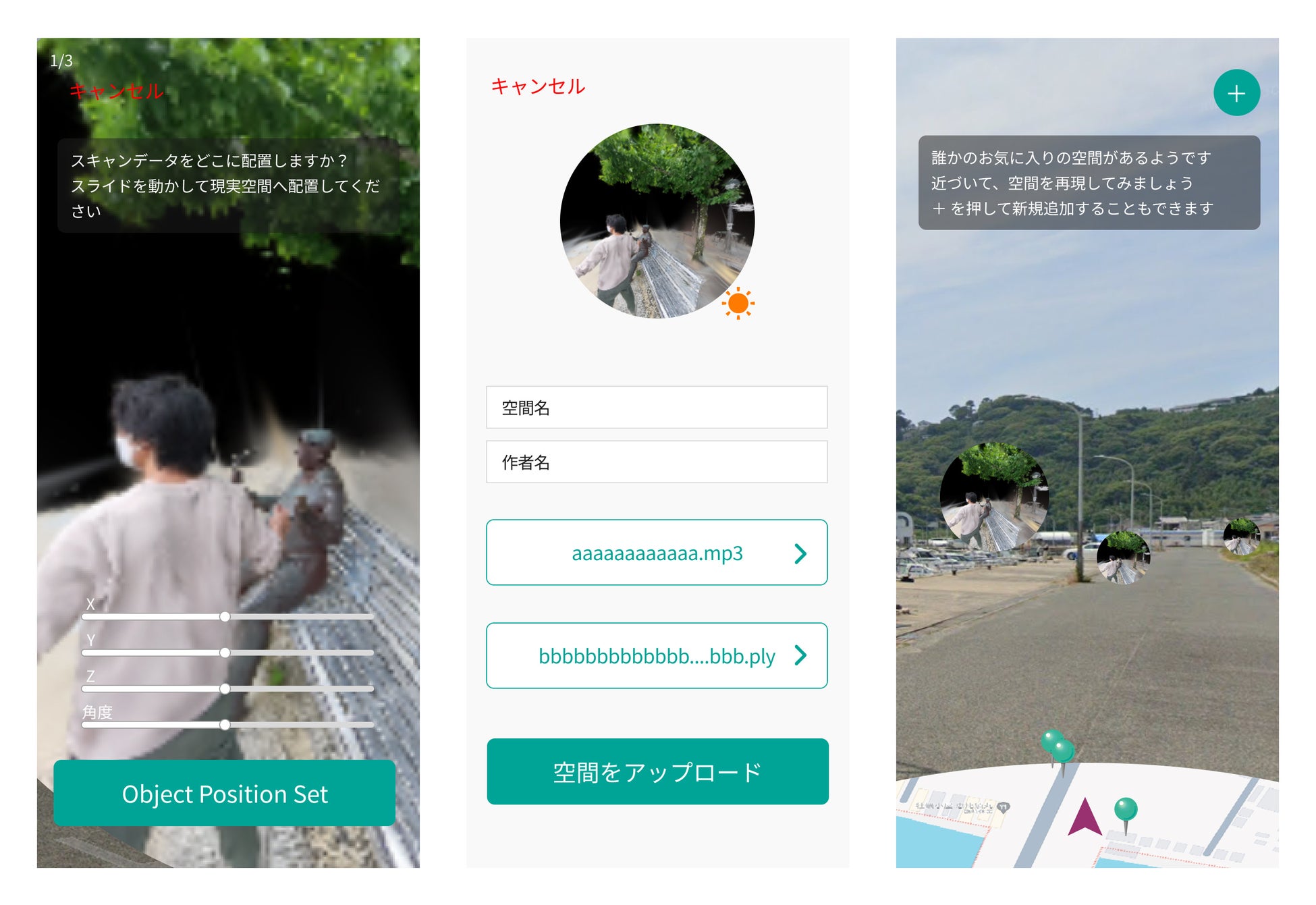 3D Gaussian Splattingとは動画や写真から3Dシーンを作成し、表現するための技術の1つであり、3Dメッシュや点群などの従来のスキャンから生成されるモデルと比較すると対象物のみならず周囲の空間も含めて高品質に表現できる手法として注目を集めています。本アプリでは、体験を共有するための表現の手法として3D Gaussian Splattingを採用し、ARとして地理空間に配置することで、作成者が体験した当時の空気感の再現を目指しています。また時間帯や天気などの状況が屋外での空間体験に大きく影響を与えることを考慮し、天気APIから当時の天候を自動取得して表示することで、実際の天候と比較しながら追体験ができるようにしています。