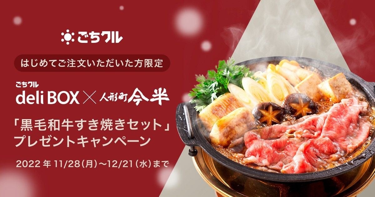 日本最大級のフードデリバリーの総合モール「ごちクル」を展開するスターフェスティバル株式会社(本社:東京都港区、代表取締役CEO:岸田祐介)は、「ごちクル」ではじめてご注文いただいた方限定で、人形町今半「黒毛和牛すき焼きセット」の「ごちクル deli BOX」を抽選で30名様にプレゼントいたします。