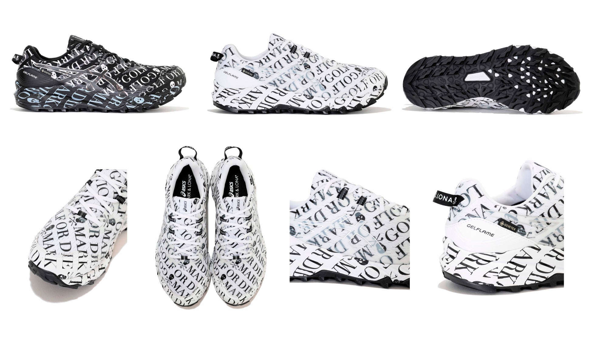 MARK & LONA × ASICSのコラボレーションシューズの新作が2023年8月30日(水)より MARK & LONA青山店と公式オンラインストア先行販売、2023年9月6日(水)より全直営店舗にて発売致します。 今回のコラボレーションシューズは、難しい地形や山道、気象条件に遭遇したときでも対応できるトレイルランニングシューズ「GEL-Trabuco 10 GTX」をベースにゴルフシューズとして生まれた世界初展開のスパイクレスシューズ「GELFLAME GTX(ゲルフレイム ジーティエックス)」。デザインは、MARK & LONAのアイコンであるアイアンスカルとブランドロゴのダイアゴナル柄を全面にあしらった大胆なデザインが特徴。ミッドソールにまで柄がプリントされており、非常にシャープでスタイリッシュなオリジナルパターンを採用しています。かかとの内側には、ワンポイントでピンフラッグをプリントしており遊び心溢れるモチーフ使いにも注目です。機能面では、アッパー部分に防水性・透湿性・防風性に優れた「GORE-TEXファブリクス」を採用しているのが大きな特徴。さらに、リサイクルポリエステル糸を採用しており地球環境に優しい素材となります。アッパーの裏側には補強材を部分的に配置し、スイング時の安定性と足入れの柔らかさを両立。ミッドソールのかかと部分には、衝撃緩衝機能GEL(ゲル)を内蔵しています。また、従来のゴルフシューズに比べて軽量なので持ち運びにも便利な一足です。