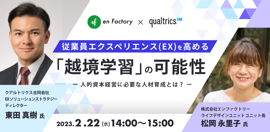 株式会社エンファクトリー(東京都渋谷区、代表取締役社長CEO加藤健太、以下、弊社)は、2023年02月22日(水)14:00-15:00よりクアルトリクス合同会社と『従業員エクスペリエンス (EX)を高める「越境学習」の可能性』をテーマに人事向けウェビナーを開催します。