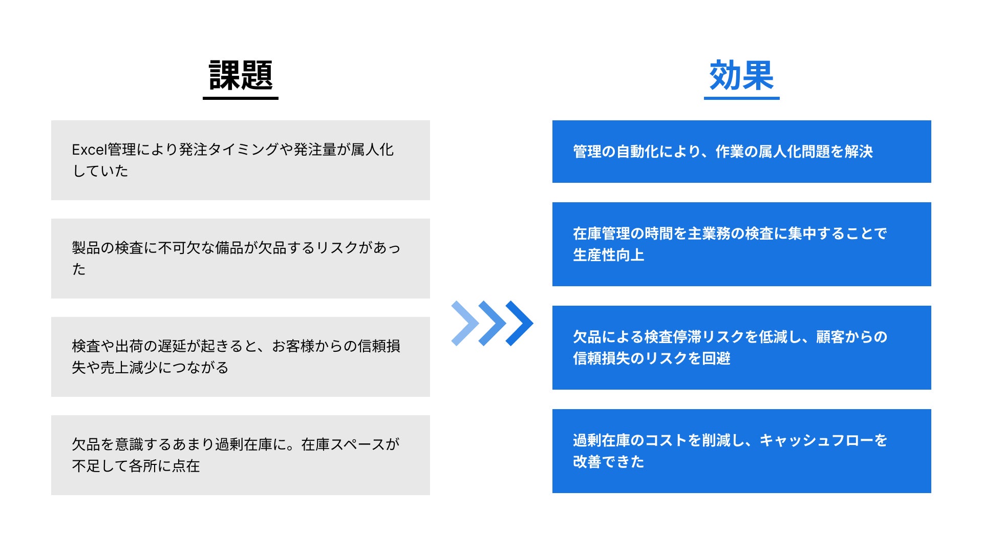 16人で約6時間半かかっていた月1回の棚卸を自動化。検査資材の実在庫管理で納期遅延リスクを低減