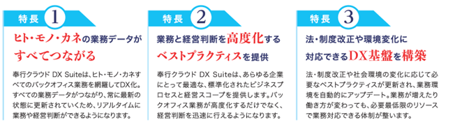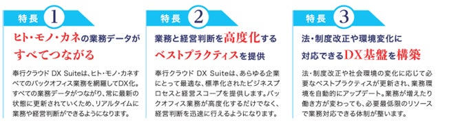 『奉行クラウド DX Suite』は、これまで経理・人事労務・販売管理の業務領域で培ってきたベストプラクティスをもとに、標準化・最適化されたビジネスプロセスを提供し、あらゆる企業のバックオフィス業務をDX化します。また、標準化・最適化された経営スコープの提供によって、より迅速に、あらゆる経営指標がリアルタイムに手に入る環境を提供します。