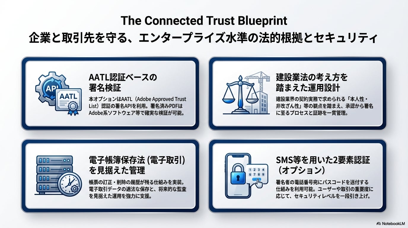 建設業界の契約実務で求められる本人性・非改ざん性等の観点を踏まえ、承認〜署名に至るプロセスと証跡を一貫して管理できるよう設計しています。