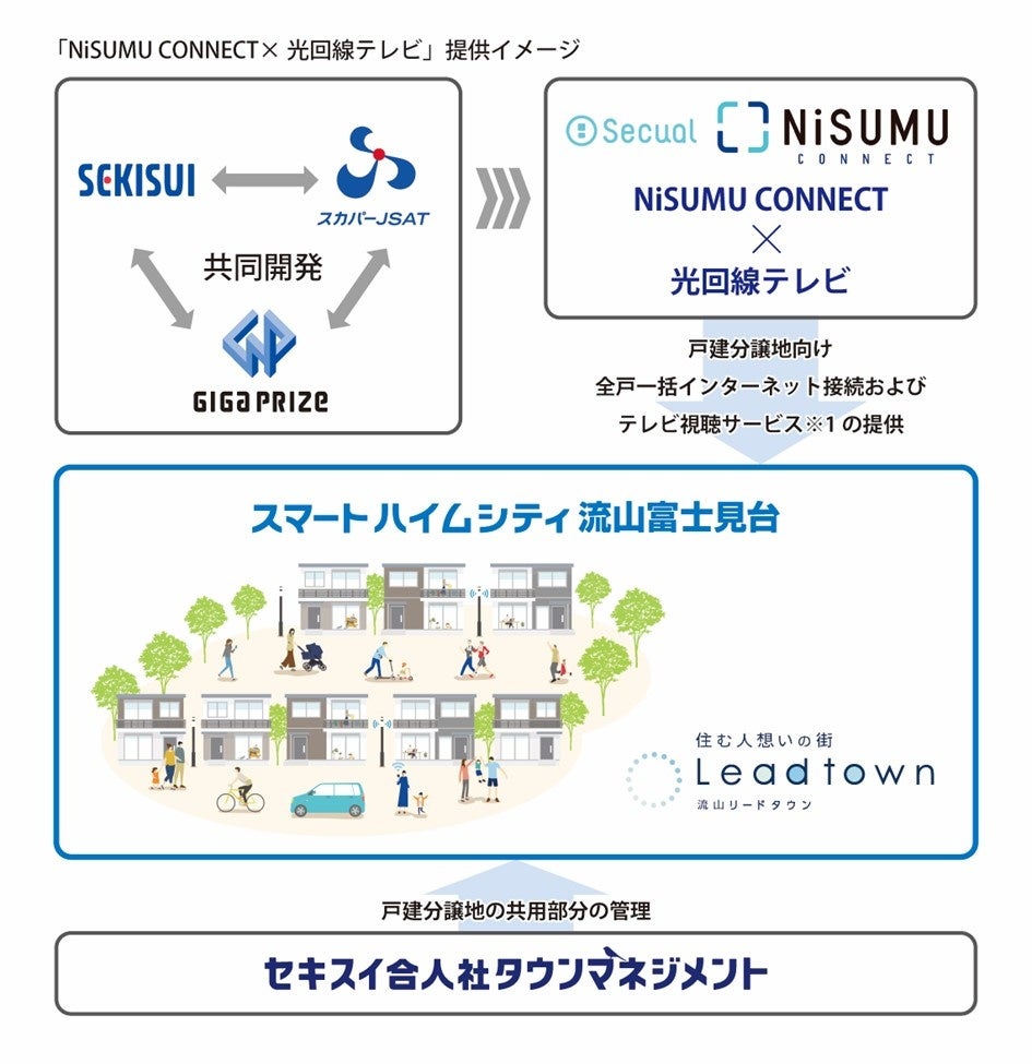 積水化学工業株式会社 住宅カンパニー(プレジデント:神吉利幸、以下「積水化学」)、株式会社ギガプライズ(代表取締役社長:佐藤寿洋、以下「ギガプライズ」)、スカパーJSAT株式会社(代表取締役執行役員社長:米倉英一、以下「スカパーJSAT」)、株式会社Secual(代表取締役CEO:菊池正和、以下「Secual」)は、戸建分譲地向け全戸一括インターネット接続およびテレビ視聴サービス※1「NiSUMU CONNECT(ニスム コネクト)×光回線テレビ」を開発し、積水化学が展開する大規模分譲地「流山リードタウン」内の戸建分譲街区「スマートハイムシティ流山富士見台」(以下「SHC流山富士見台」)で提供を開始します。