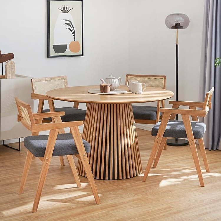 自宅でリゾートのようなくつろぎを感じられるよう、当社デザイナーが細部にまでこだわったLOWYAオリジナルデザインのダイニング。台座には細やかに組み合わされたオークの天然木を、天板には木目の美しいオーク突板を使用しています。円形だからこそ「どこでも同じように座れる」のがこの商品の大きな魅力。このテーブルにオススメのチェアはテーブルと同じオークの天然木を贅沢に使ったラタン調チェア。本物のラタン(籐)ではなく、ポリエチレンを使用することでお手入れが気軽に行うことができるのも嬉しいポイントです◎
