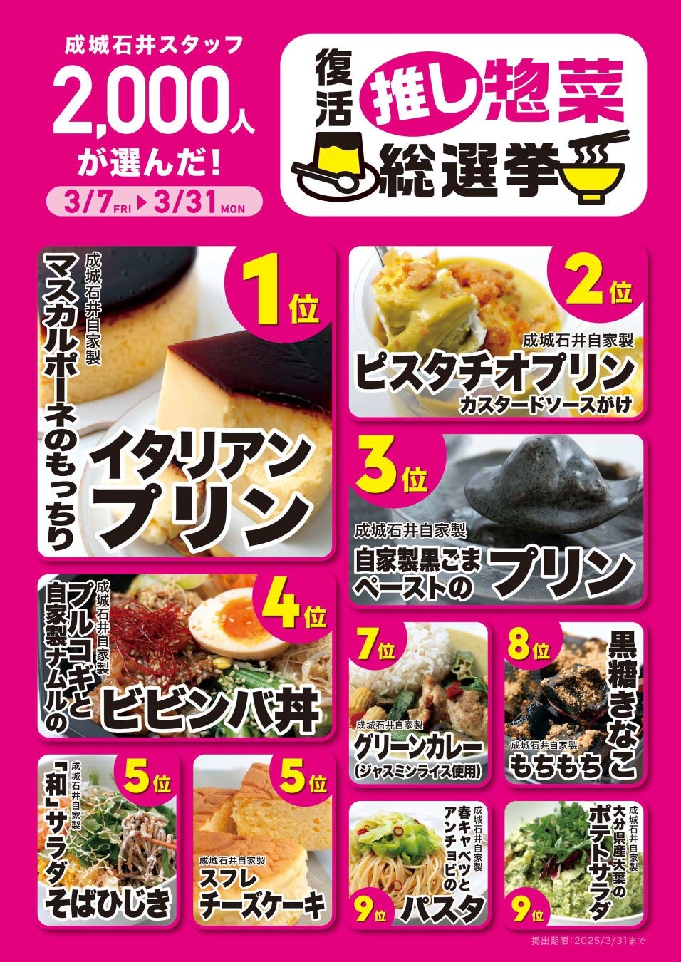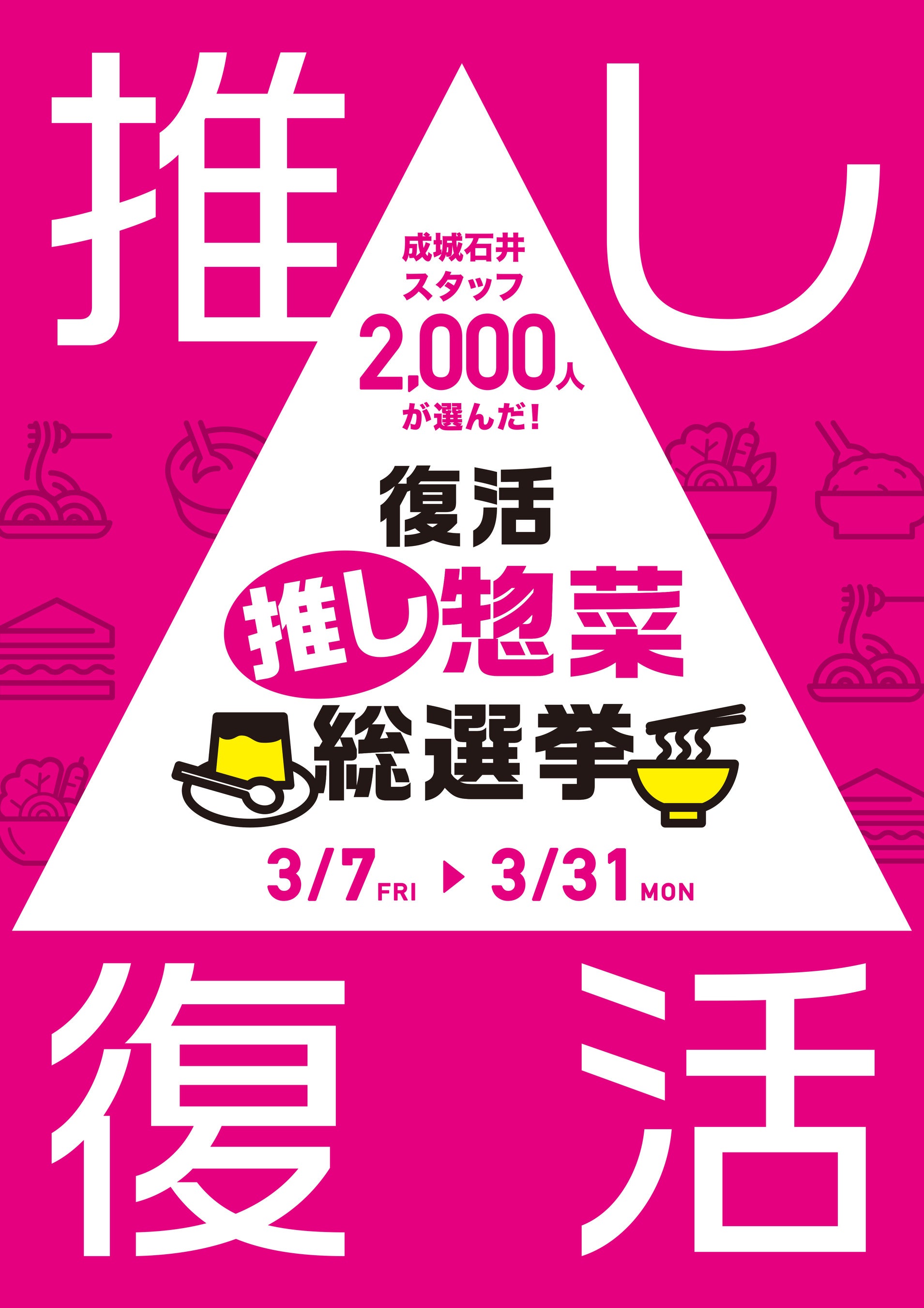 株式会社成城石井(本社事務所:神奈川県横浜市西区北幸、代表取締役社長:後藤勝基)は、「成城石井スタッフ2,000人が選んだ!復活“推し惣菜”総選挙!!」を2025年3月7日(金)から3月31日(月)まで、成城石井の全店で開催いたします。