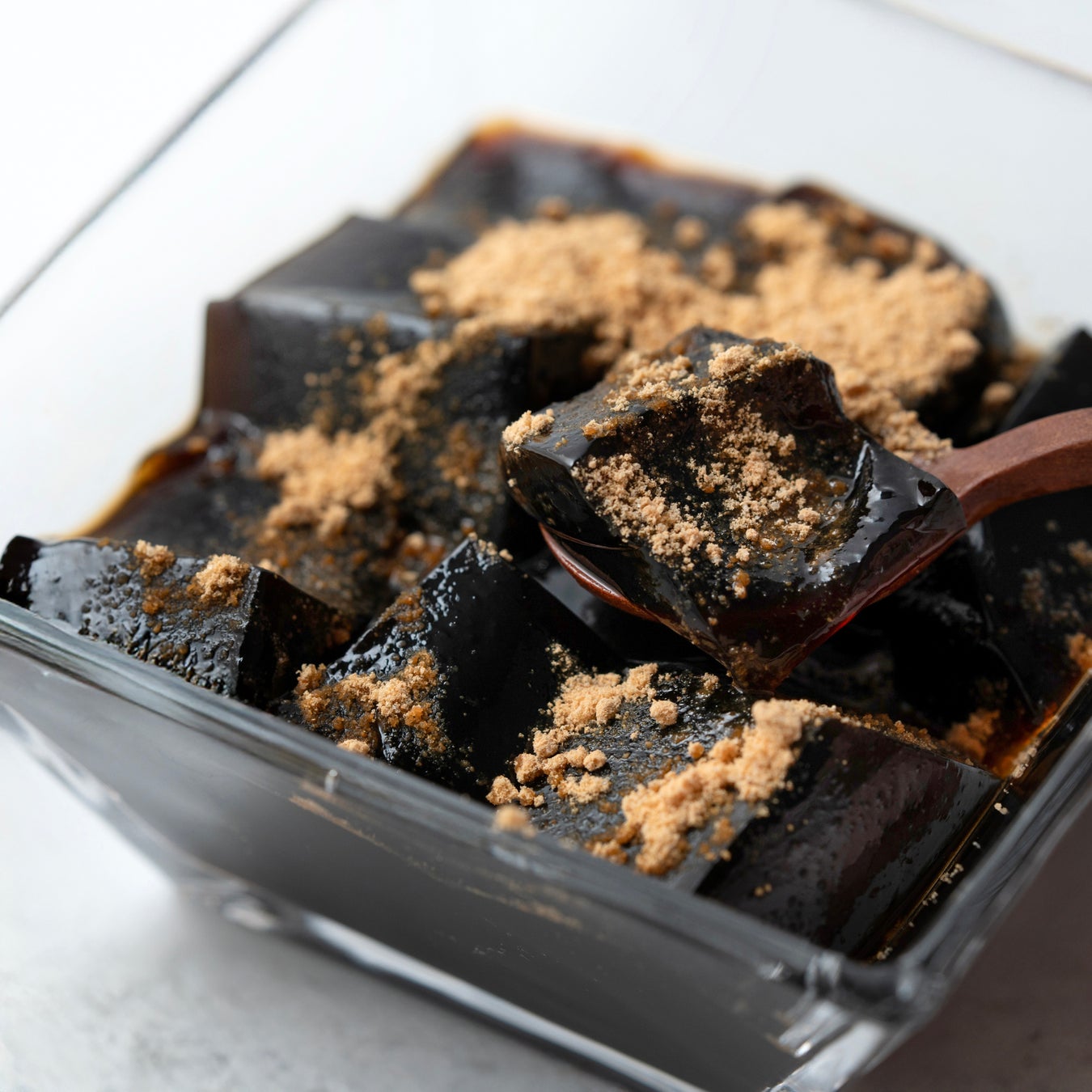香り豊かで濃厚な味わいの沖縄県産黒糖で作られた黒蜜を使用。黒蜜の上品な甘さと、もちもちとしたゼリーの食感を存分にお楽しみいただける一品です。お好みで黒蜜の濃厚な味とマッチする国産大豆のきなこ(別添)をまぶしてお召し上がりください。