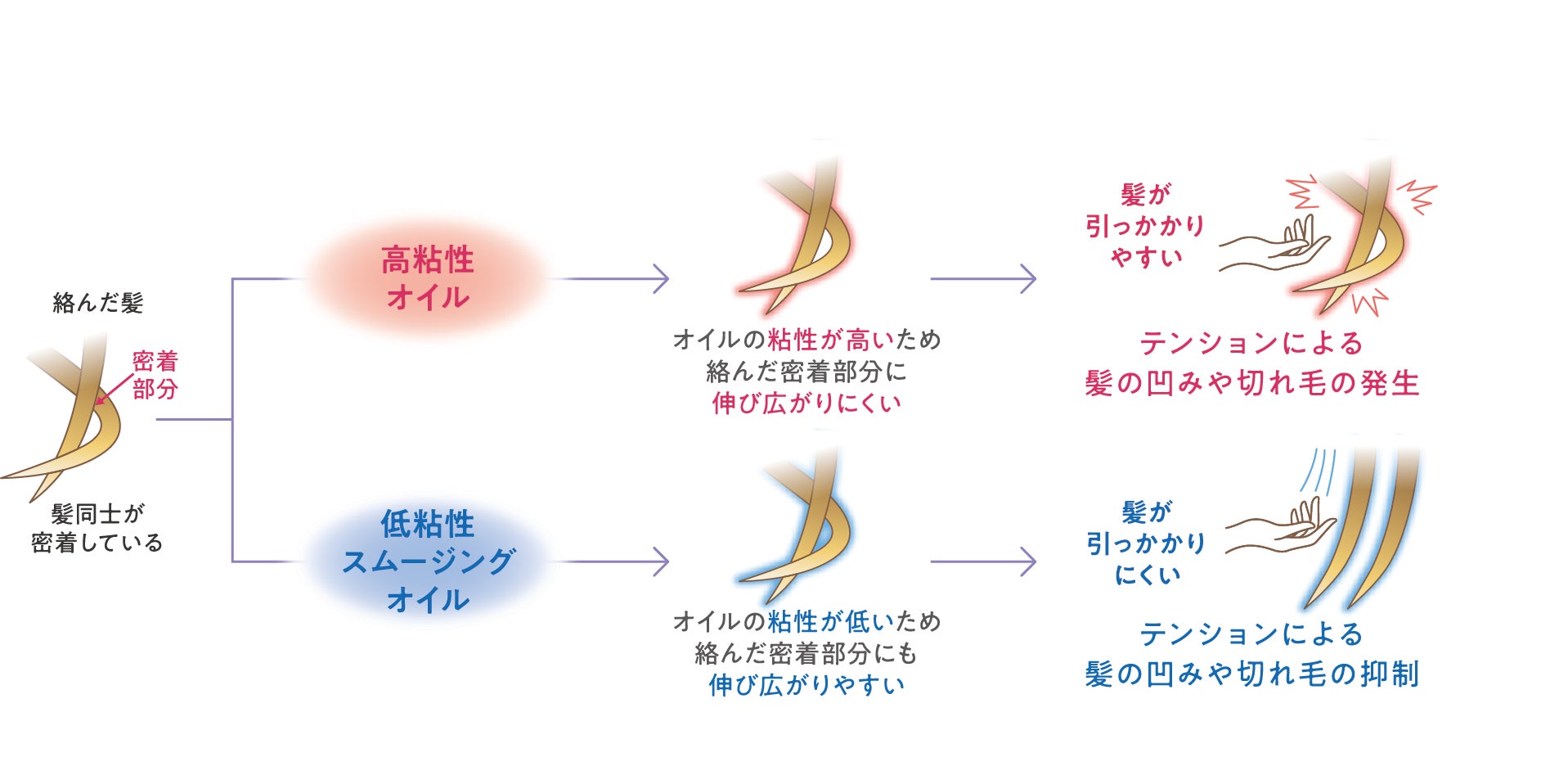 「スムージングオイル」とは:濡れて密着した毛髪へも伸び広がりやすい粘性が極めて低いオイル。