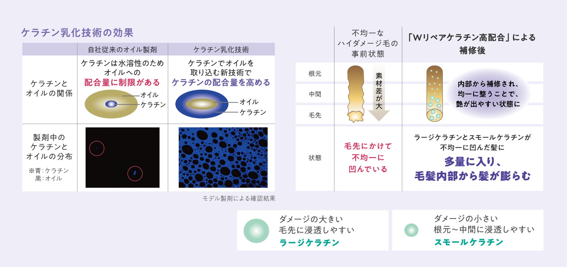 ケラチン乳化技術によりオイルへの「Wリペアケラチン」高配合を達成。不均一なハイダメージを内部から補修し、均一に整えます。