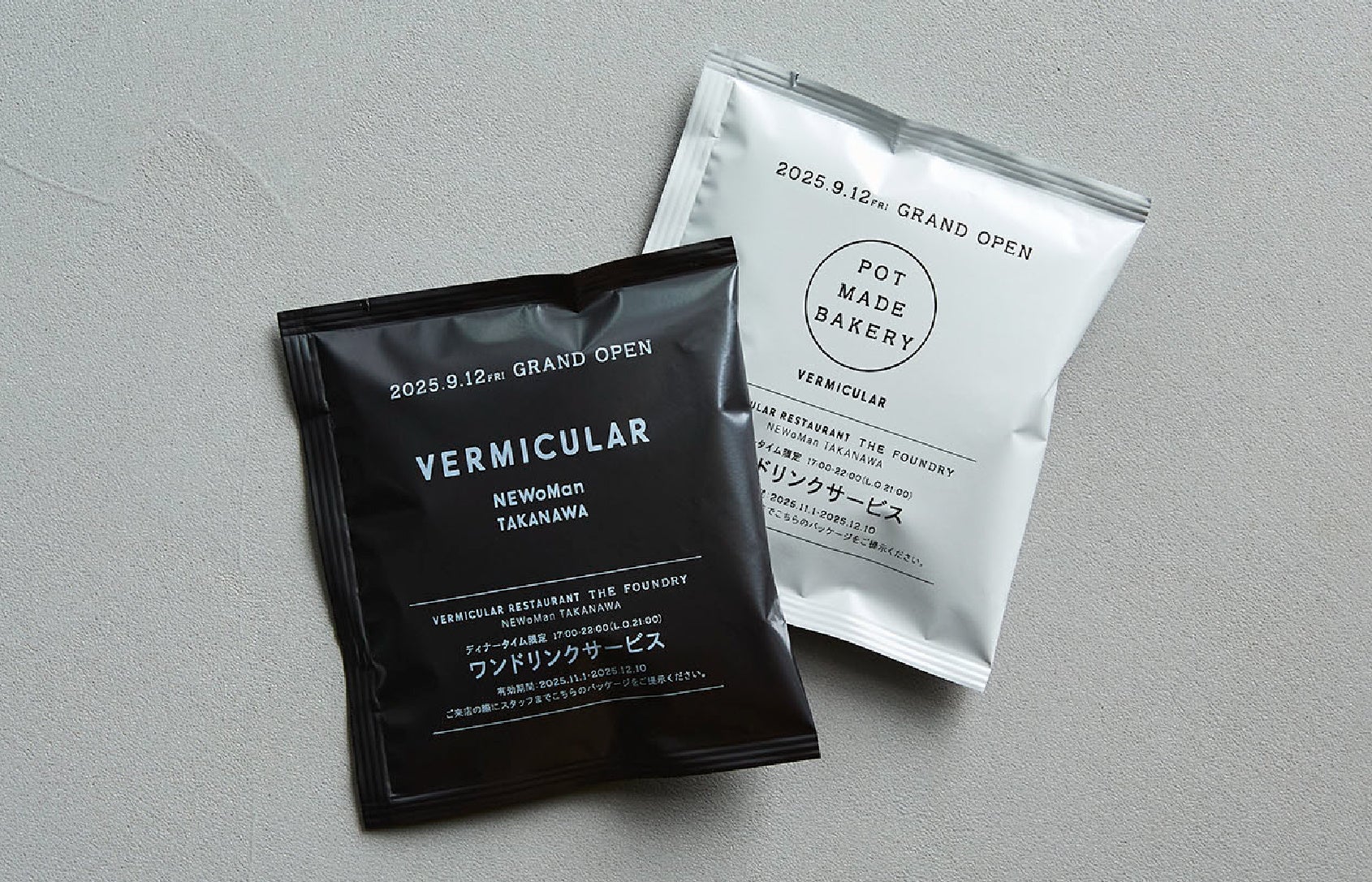 2025年9月12日(金)のグランドオープンを記念して、9/12(金)~9/30(火)の期間、バーミキュラ ニュウマン高輪店のフラッグシップショップ、レストラン、ベーカリーでお買い物・お食事をされたお客様に、先着でバーミキュラオリジナルブレンド ドリップコーヒーや鋳物ホーロー製のカトラリーレスト、オリジナルステッカーなど、豪華ノベルティをプレゼントいたします。
