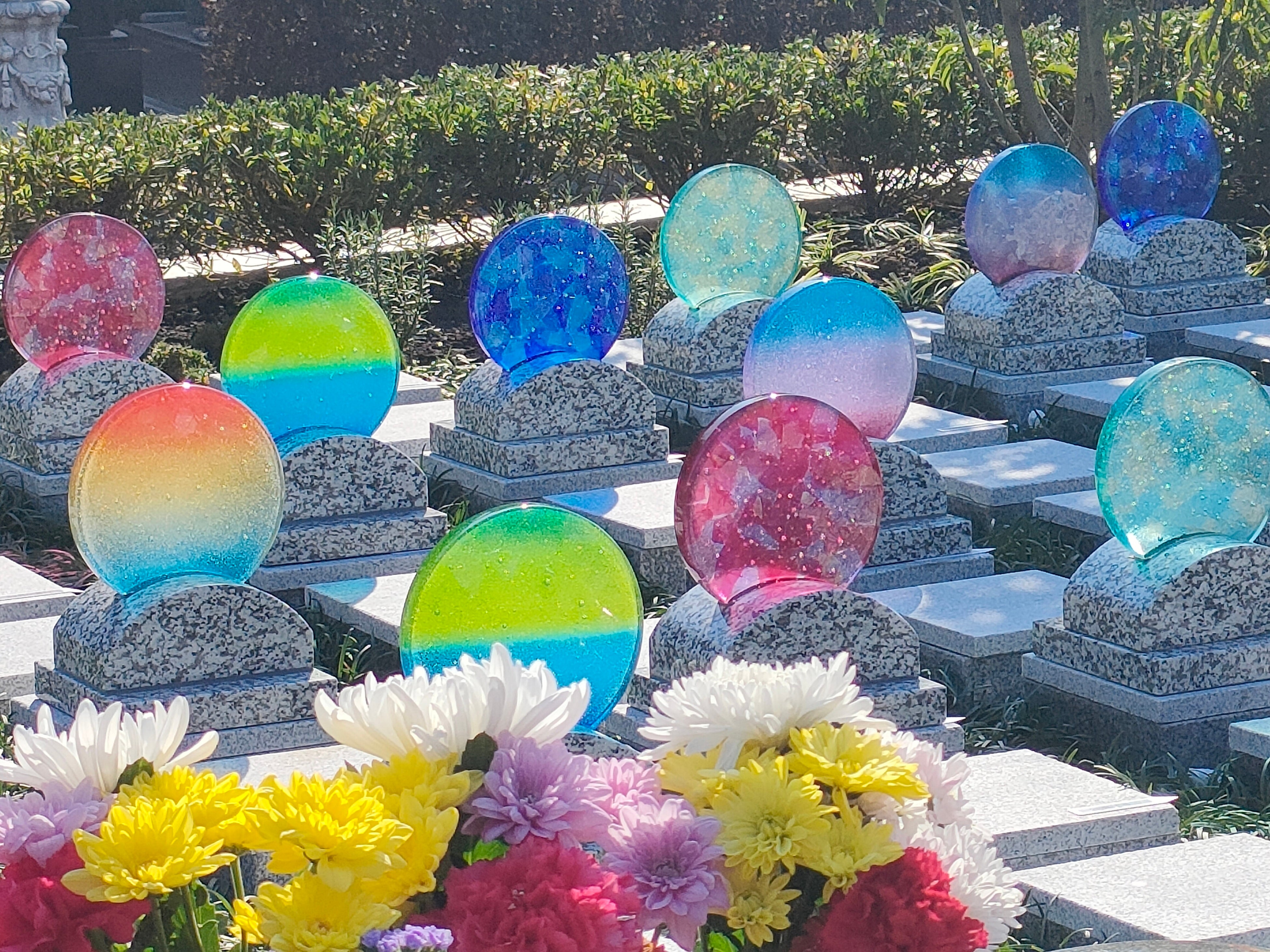 「光り墓」とは、株式会社フクイシ(本社:福島、代表取締役社長:佐藤 真也)が販売するガラス製の墓石です。「数十年後の霊園は光で満ちている」という信念から生まれた「光り墓」は、アートガラスでご遺族の心を照らす新しい墓石となっており、千葉県にあります釈迦寺霊園の樹木葬等で使用されています。従来の墓石のイメージを超えた故人様らしさを尊ぶ「最後のプレゼント」として選ばれています。