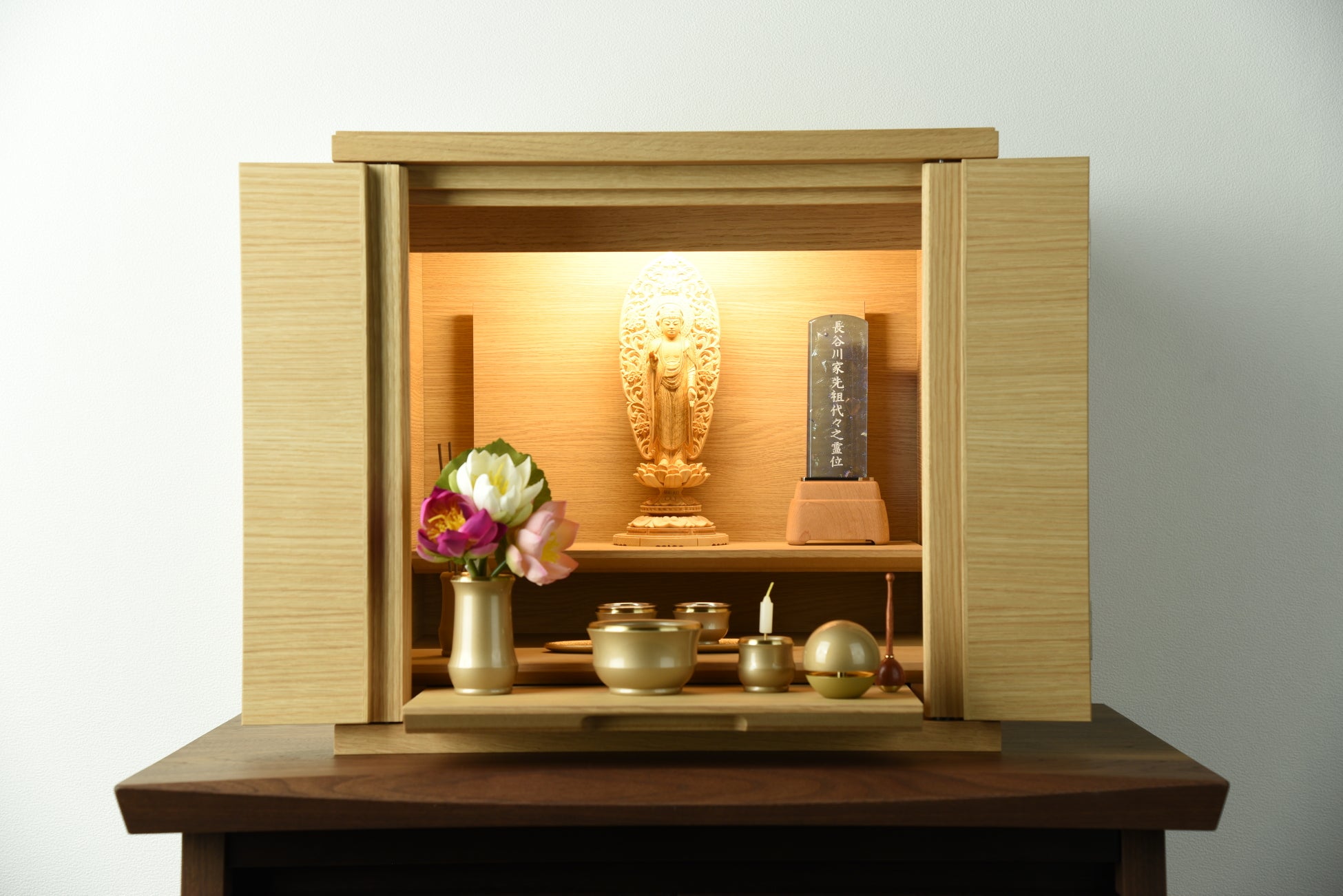 明るいトーンのお仏壇では自然で落ち着いた表情を、暗いトーンのお仏壇では深く厳かな表情を見せてくれます。