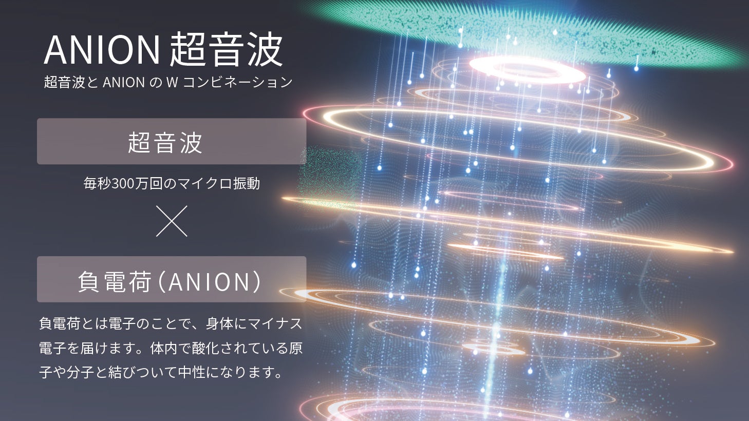 「ANION(アニオン)超音波は、超音波とANION(負電荷)を独自のノウハウを元に開発した伊藤超短波初の超音波技術です。