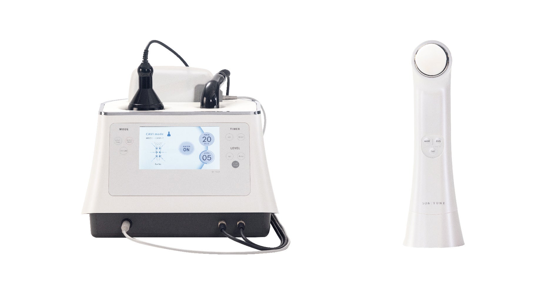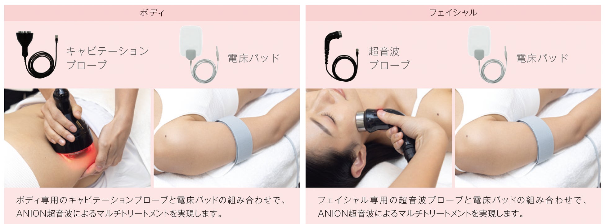 ボディに「キャビテーション+A N I O N」、フェイシャルに「超音波+ A N I O N」を搭載しました。効率的なボディ&フェイシャルトリートメントをシンプルな操作で提供できます。