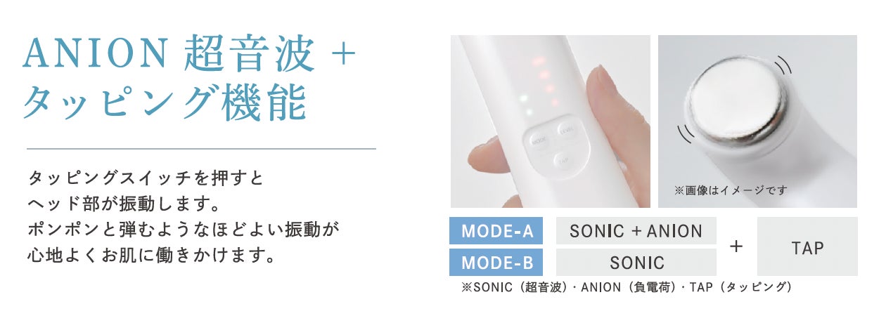 超音波によるマイクロ振動に加え、ANION(負電荷)が酸化されている原子や分子に働きかけることで、1台でマルチトリートメントを可能にします。