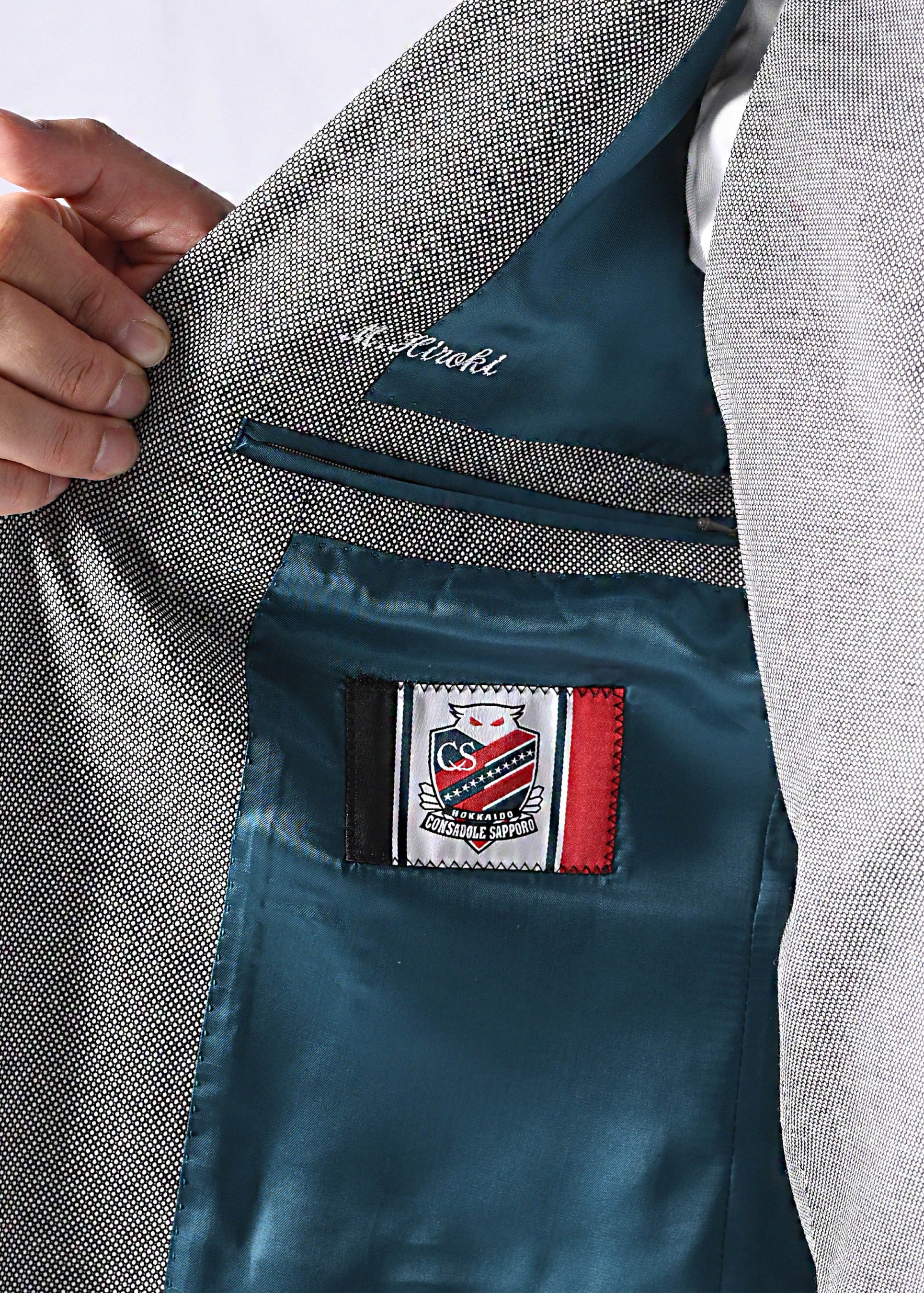 ジャケット:シングル2つ釦、チームフラッグが刺繍された織ネームやオリジナル刻印釦、裏地にはチームカラーの“ブルーグレー”を採用