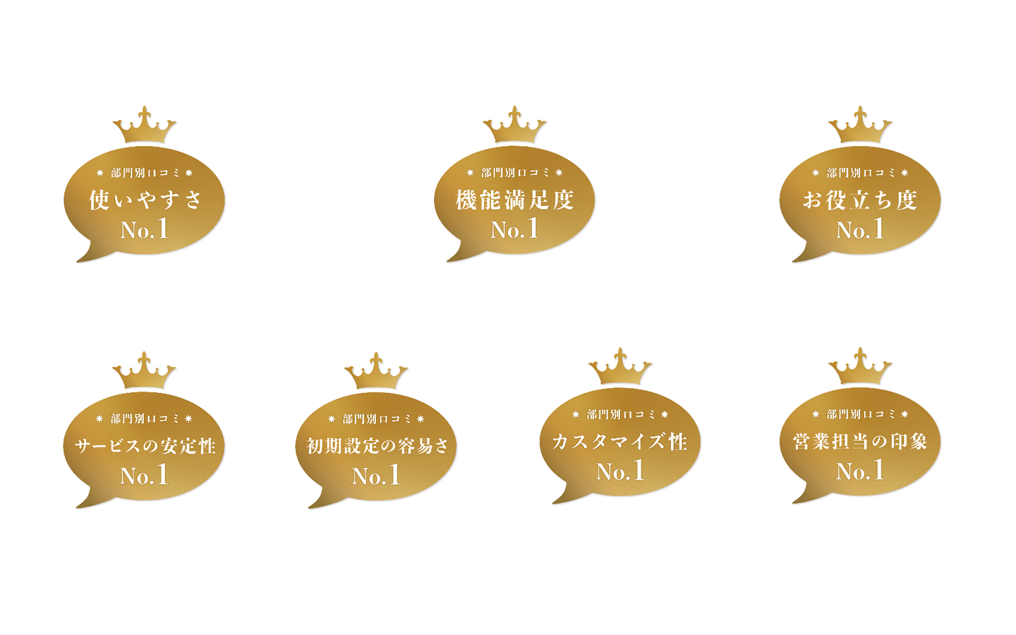 【ベスト評価賞:使いやすさNo.1、お役立ち度No.1、カスタマイズ性No.1、機能満足度No.1、サービスの安定性No.1、営業担当の印象No.1、初期設定の容易さNo.1】