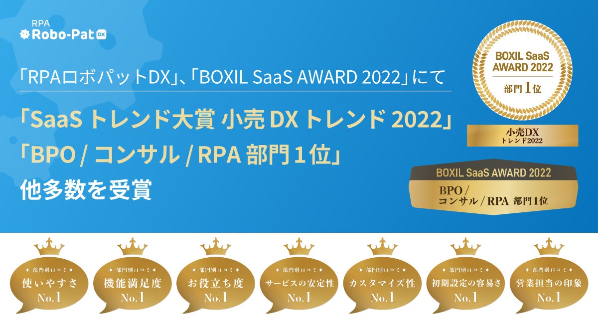 「RPAロボパットDX」BOXIL SaaS AWARD 2022にて「BPO/コンサル/RPA部門1位」「SaaS トレンド大賞 小売DXトレンド2022部門1位」他多数を受賞