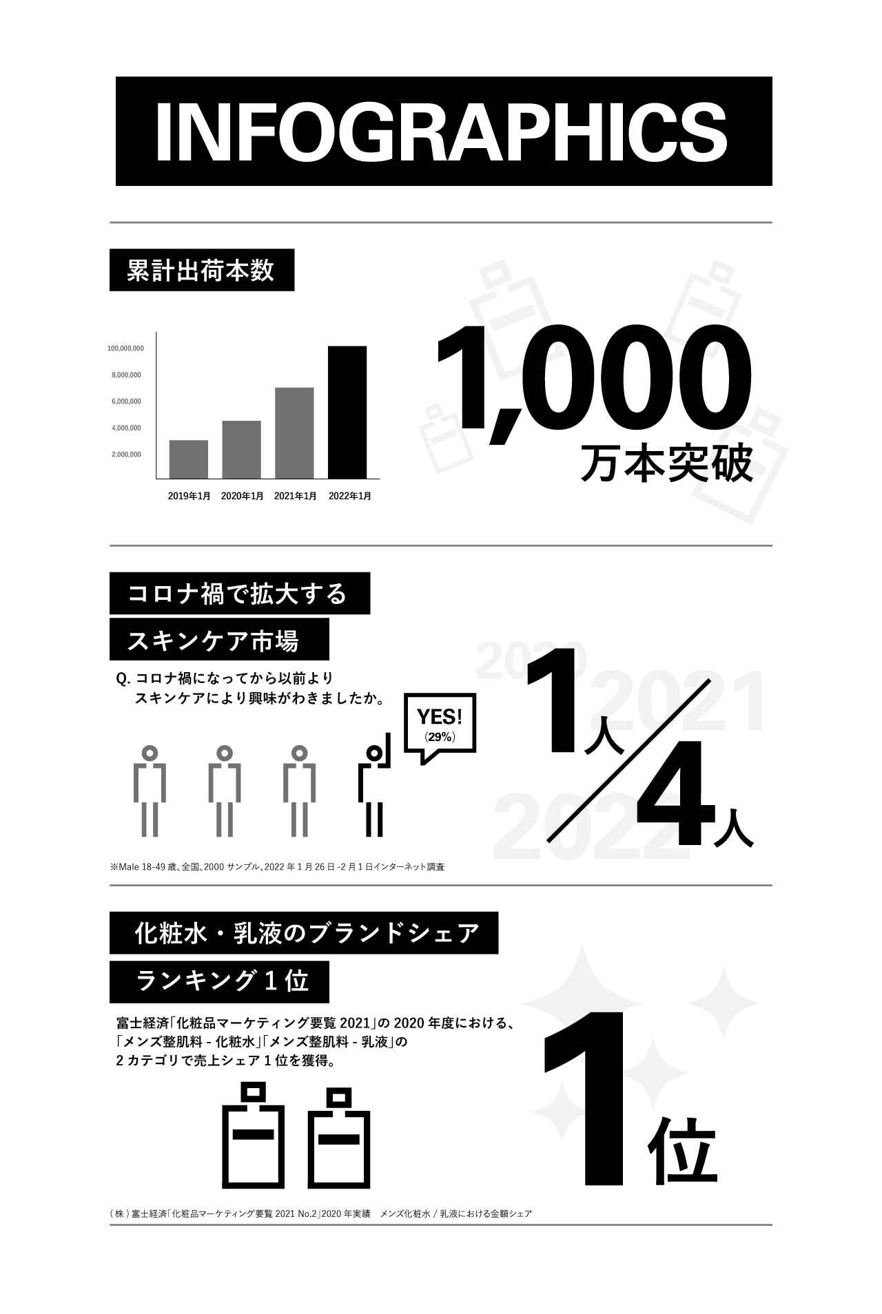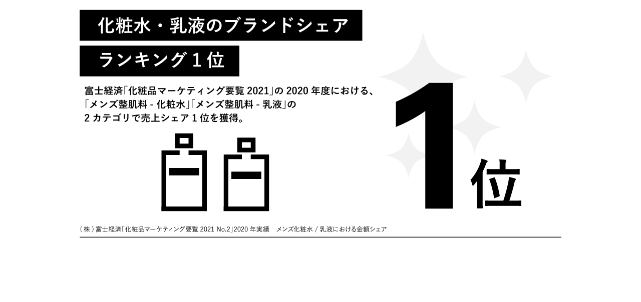 *¹:(株)富士経済「化粧品マーケティング要覧2021 No.2」2020年実績 メンズ化粧水/乳液における金額ブランドシェア