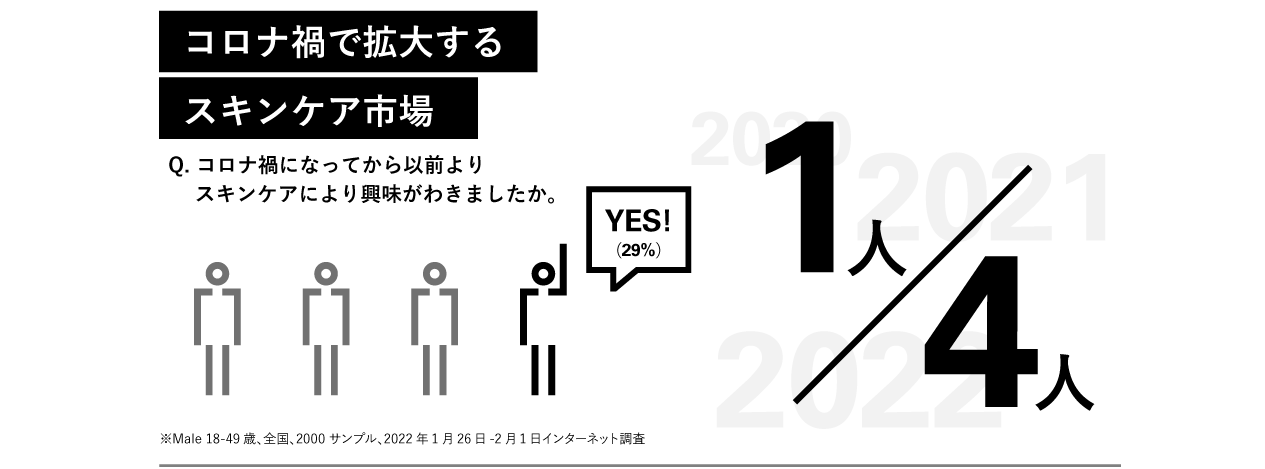 現在のマスクによる肌荒れだけでなく、「マスクを外す将来に、周りの人からどう思われるか」を気にし、マスク不要時代に備え、肌状態を整えるためのスキンケアを始めている男性が現れていることが分かりました。