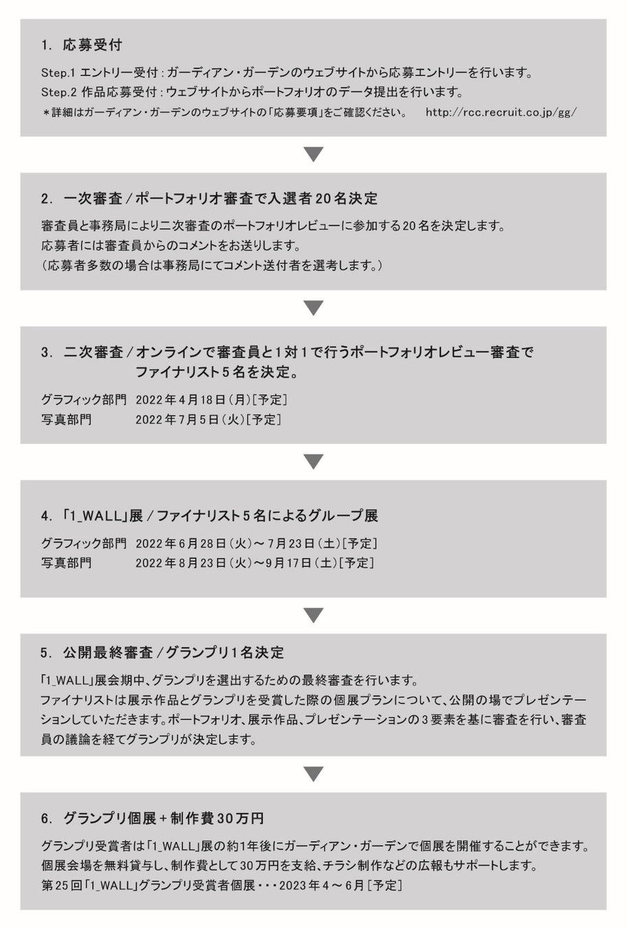 ポートフォリオ審査による一次審査と、一対一で審査員と対話をする二次審査を通過したファイナリスト5名が、一人一壁面を使って作品を発表するグループ展です。ファイナリストによるプレゼンテーションの後、審査員による議論を経て、グランプリが決定します。グランプリ受賞者には、1年後の個展開催の権利と、個展制作費30万円が贈られます。