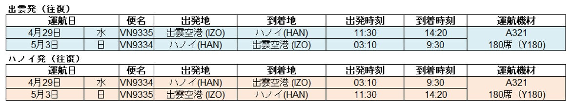 ベトナム航空 日本支社(所在地:東京都千代田区、総支配人:ゴー・シー・アイン)は、2026年4月29日(祝・水)および5月3日(祝・日)のゴールデンウィーク期間中、出雲空港とベトナム・ハノイを結ぶ第4弾直行チャーター便を運航いたします。
