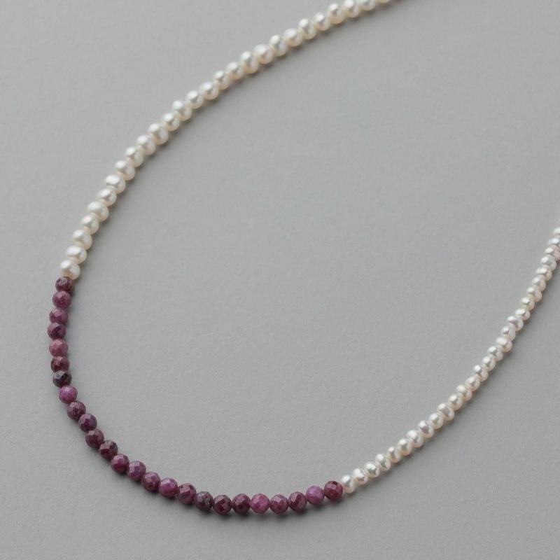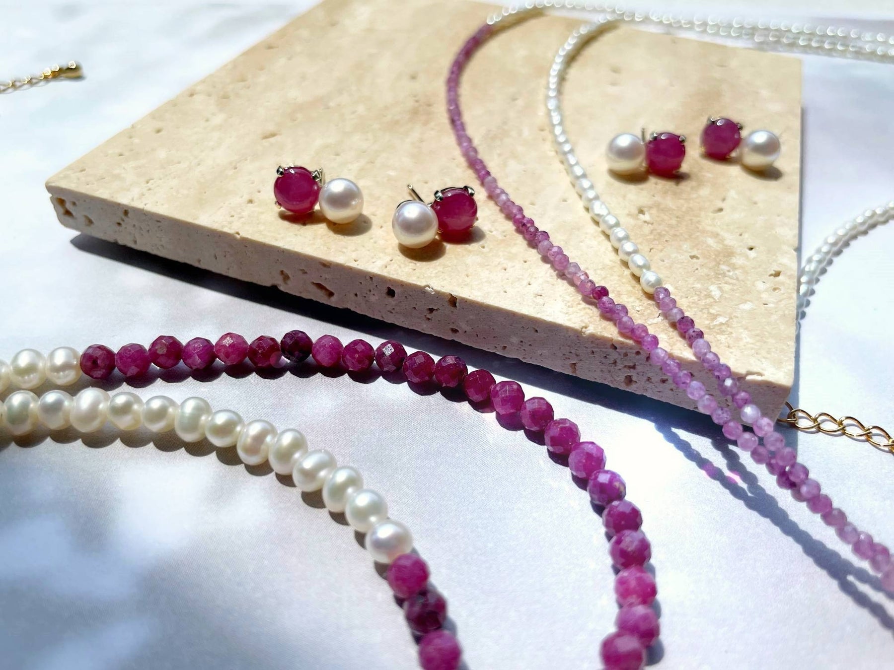 美しい深紅の輝きを放つ宝石・ルビーと真珠を合わせたパワーストーンジュエリー
