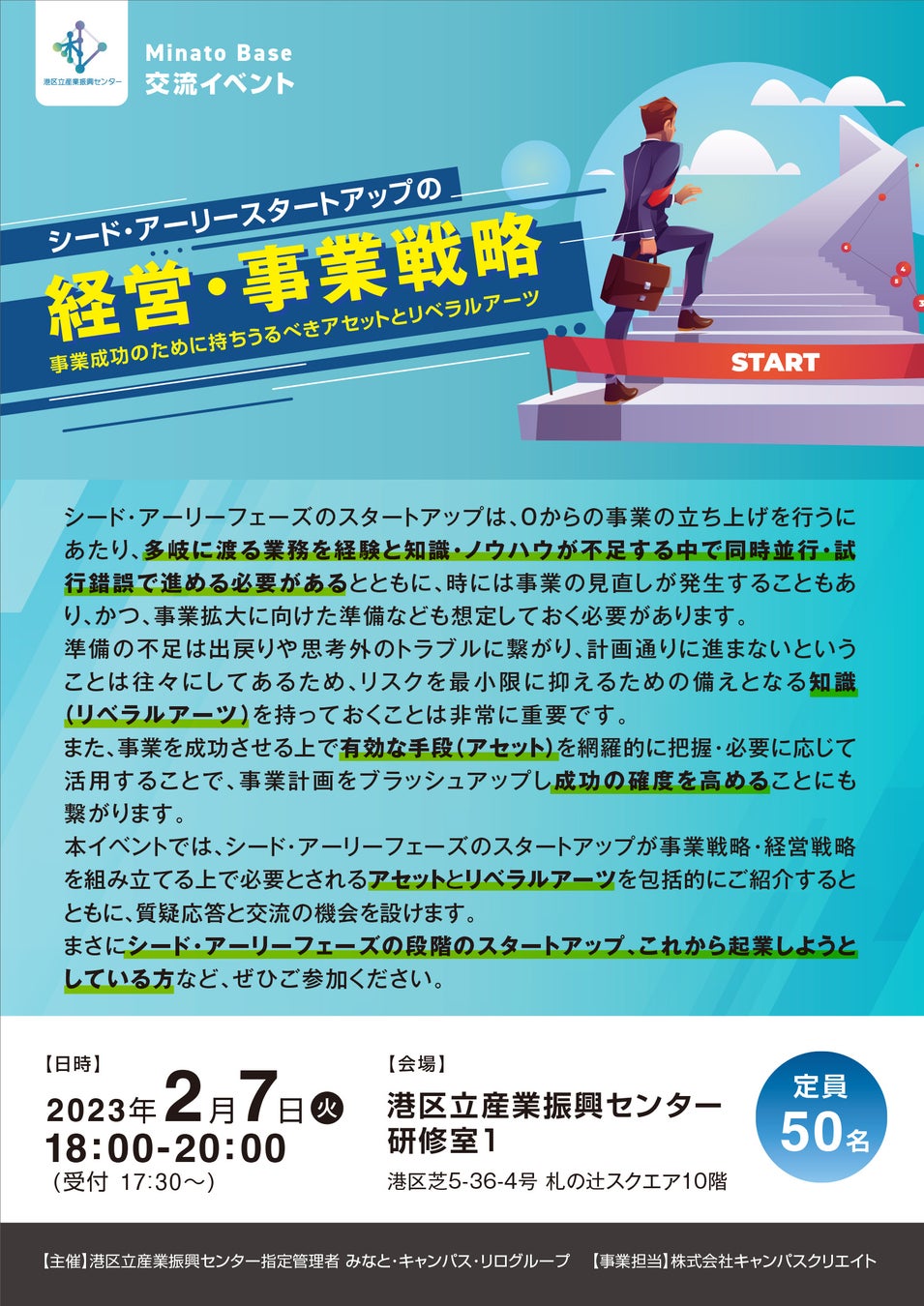 港区立産業振興センター(所在地:東京都港区)では、2月7日に「Minato Base 交流イベント シード・アーリースタートアップの経営・事業戦略 ~事業成功のために持ちうるべきアセットとリベラルアーツ~」を開催いたします。