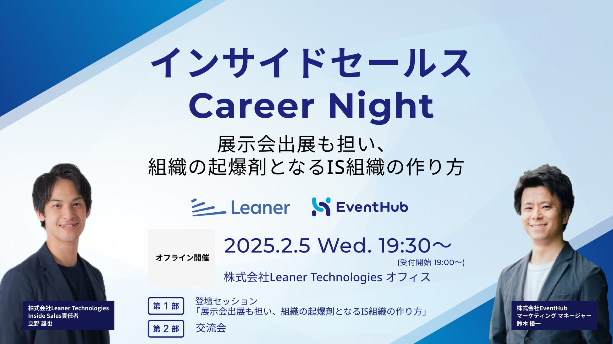 株式会社EventHub (東京都港区、代表取締役CEO:山本 理恵) が提供するシェアNo.1(※)イベント・ウェビナーマーケティングプラットフォーム「EventHub(イベントハブ)」は、2025年2月5日(水)19:30からLeaner Technologies株式会社オフィスにて「インサイドセールス Career Night 〜 展示会出展も担い、組織の起爆剤となるIS組織の作り方 〜」を開催いたします。