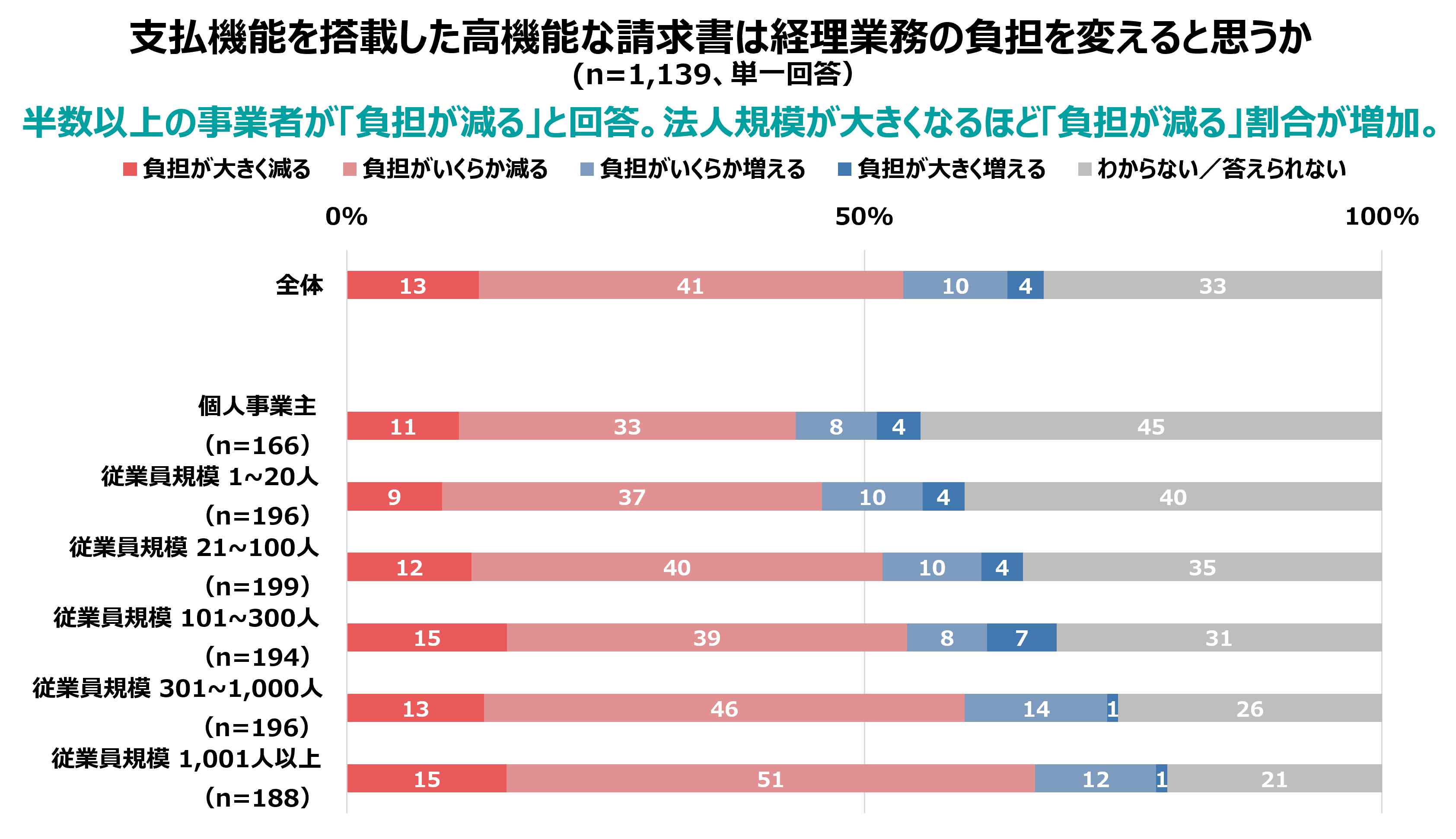 今後、ボタンをクリックするだけで登録しているビジネスカードや銀行口座から支払いが完了する高機能な請求書が登場した場合に、経理業務の負担を変えるか尋ねる質問では、54%の事業者が「負担が減る」と回答しました(図5)。また、従業員規模が大きくなるほど「負担が減る」と考える割合が増加しました。