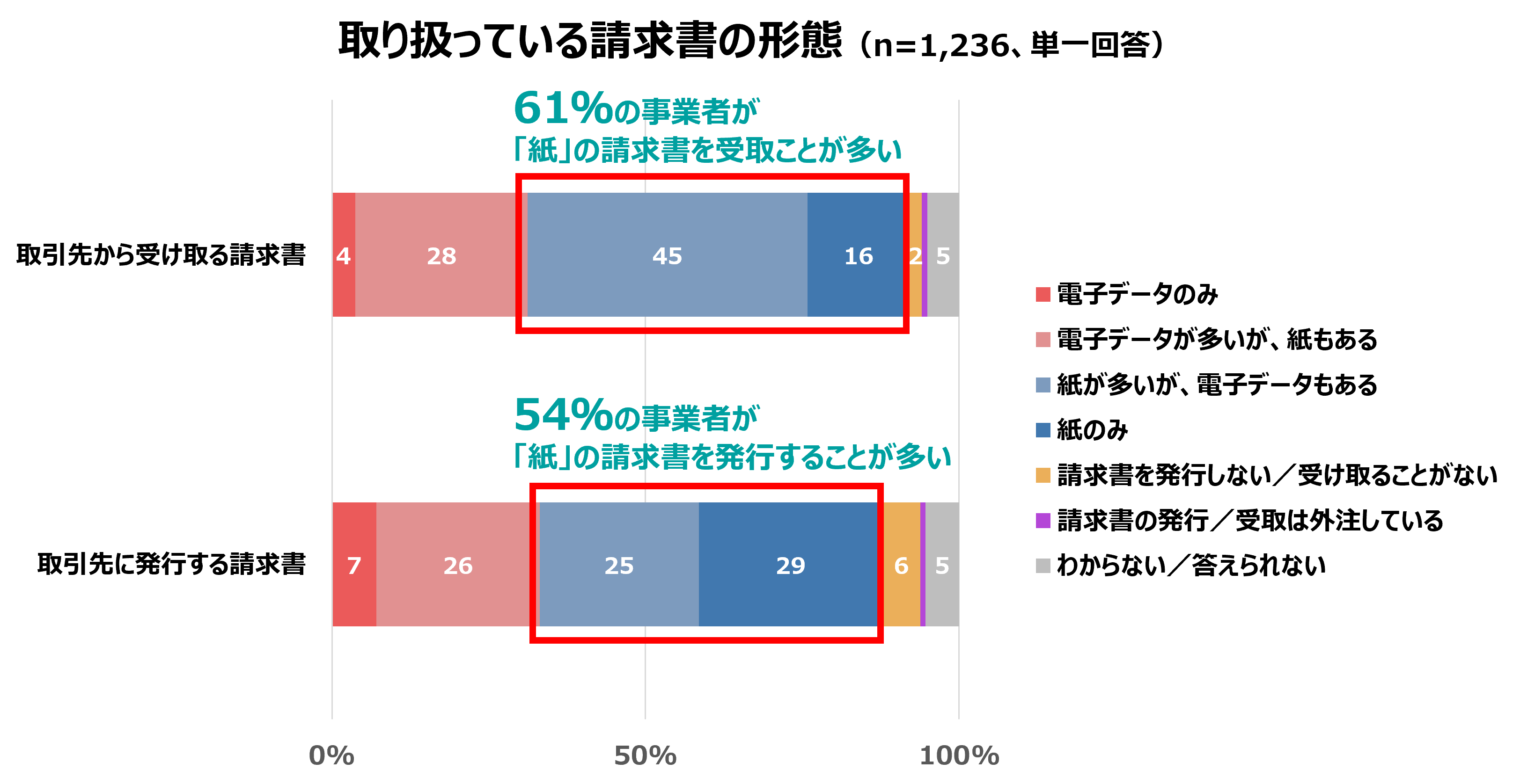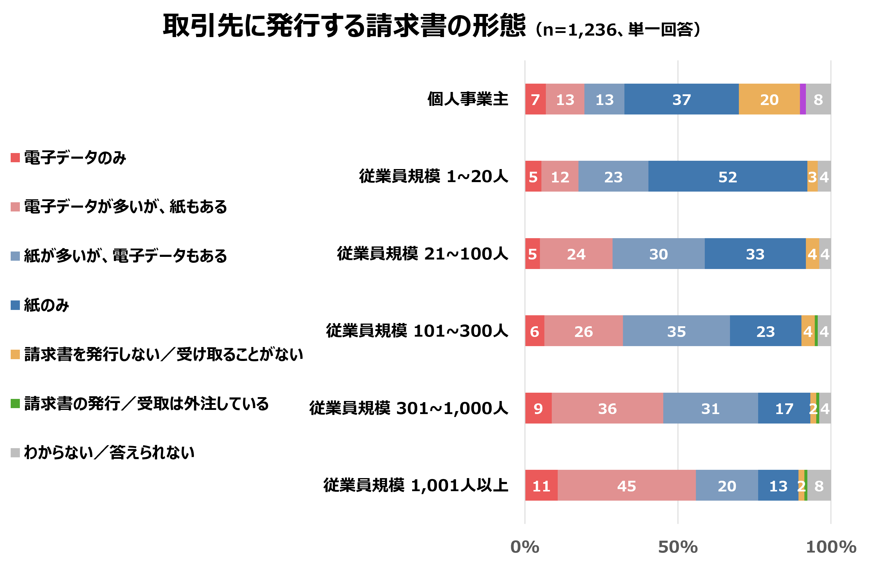 取り扱う請求書は「紙が多い」事業者が半数以上、個人・小規模事業主は「紙のみ」が最多。取引先への「支払遅延経験あり」は約3社に1社で、要因トップは「期日管理のミス」
