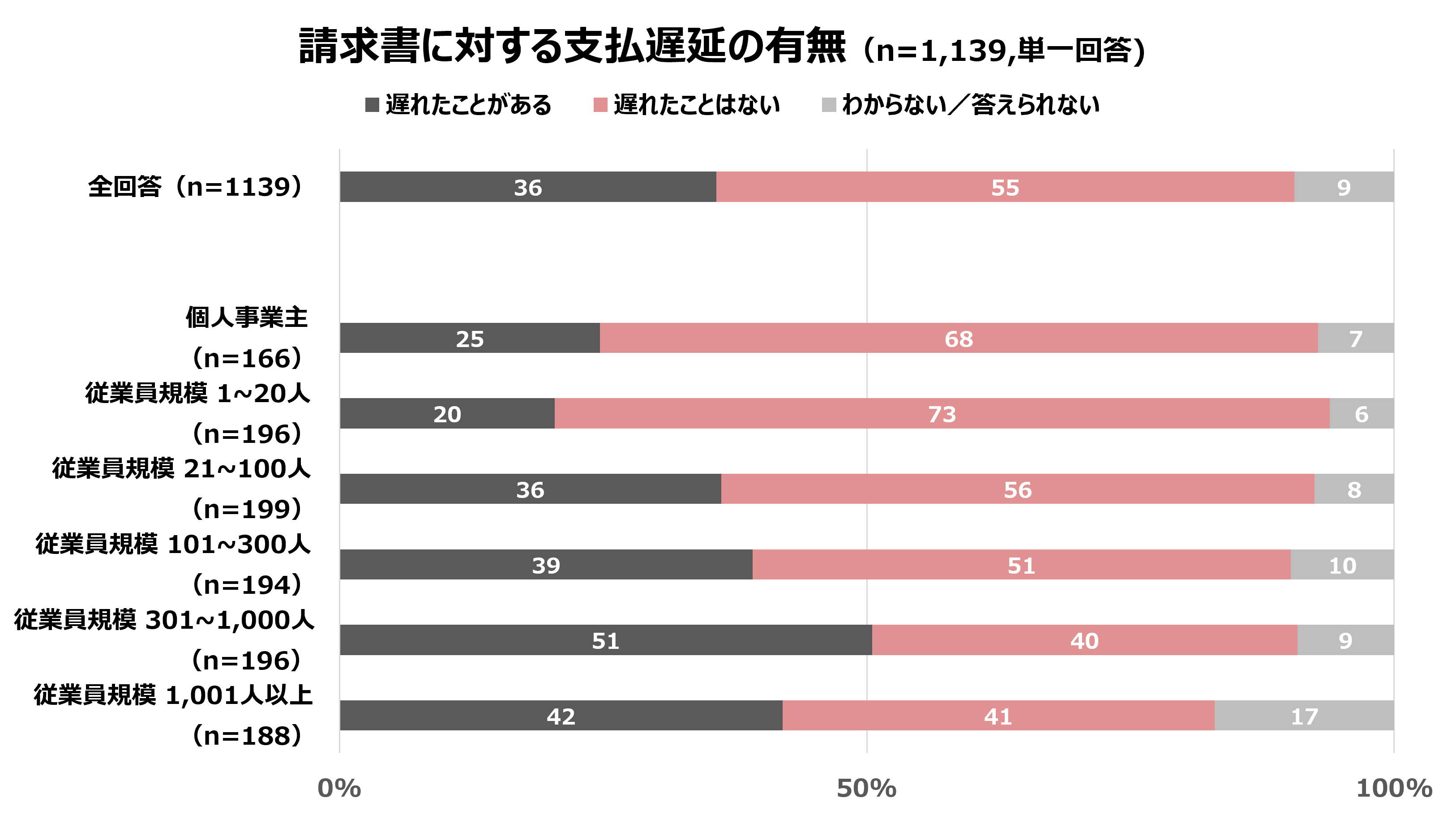 質問「直近1年間を振り返ってお答えください。あなたの勤務先では、取引先から受け取った請求書に対する支払が遅れたことがありますか。」