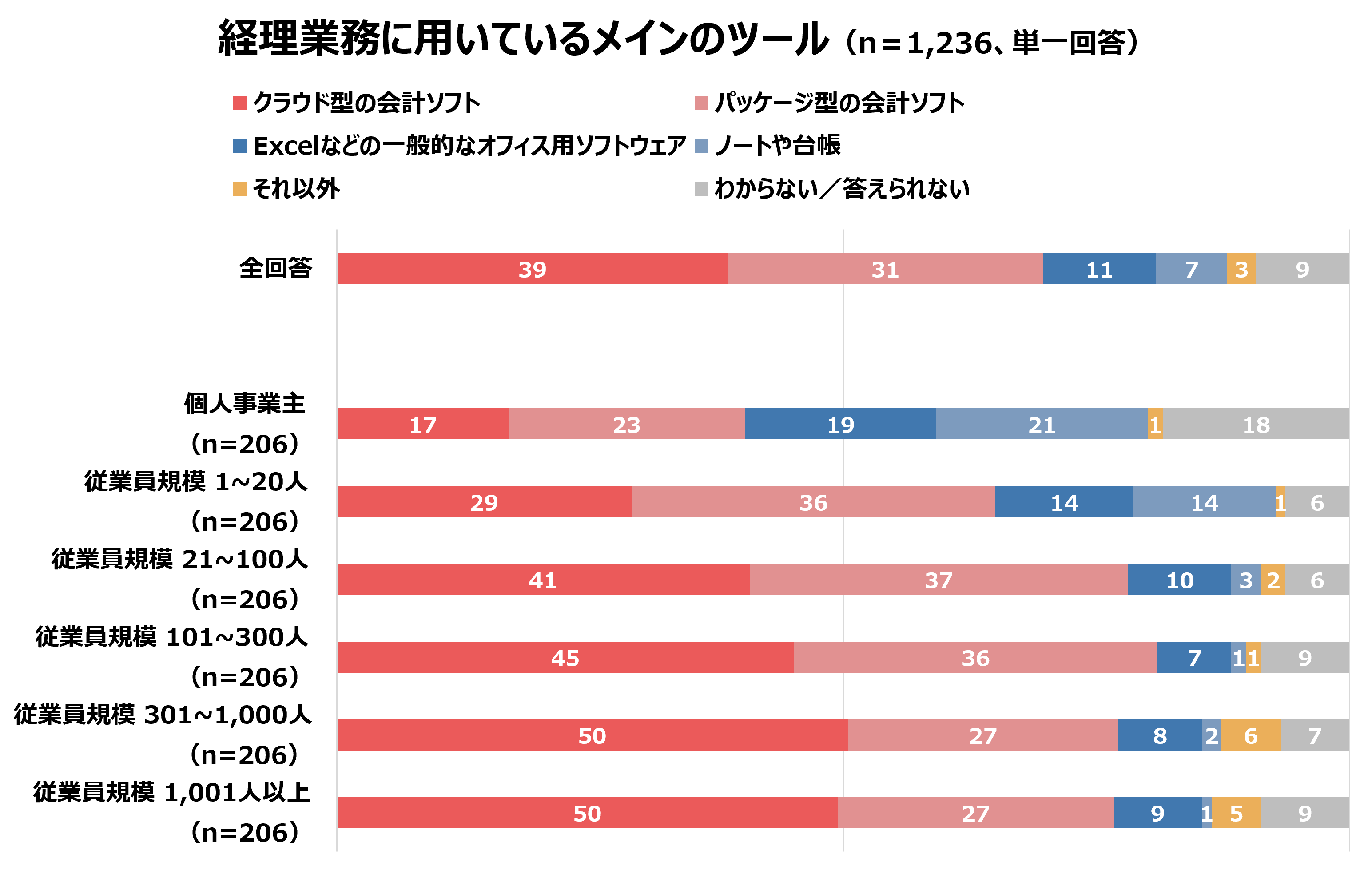 本調査では、従業員規模が大きい事業者ほど経理業務で用いるメインのツールにクラウド型の会計ソフトを利用していることが確認できました。個人事業主では、クラウド型の会計ソフトをあげた割合はわずか17%でした(図7)。