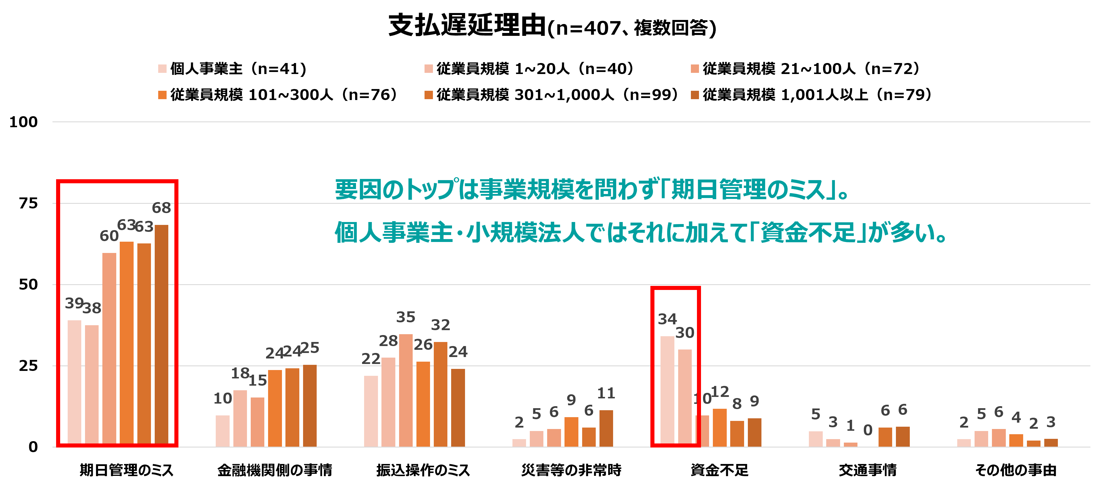 取引先への支払遅延の経験を尋ねる質問では、事業者の約3社に1社は「過去1年間に支払が遅れたことがある」と回答しました。従業員規模301~1,000人の中規模事業者では半数を超えています(図3)。支払遅延の要因としては、「期日管理のミス」が事業規模に関わらずトップです。加えて、個人事業主・従業員規模が100人未満の小規模事業者では、「資金不足」の要因が高くなる傾向がありました(図4)。