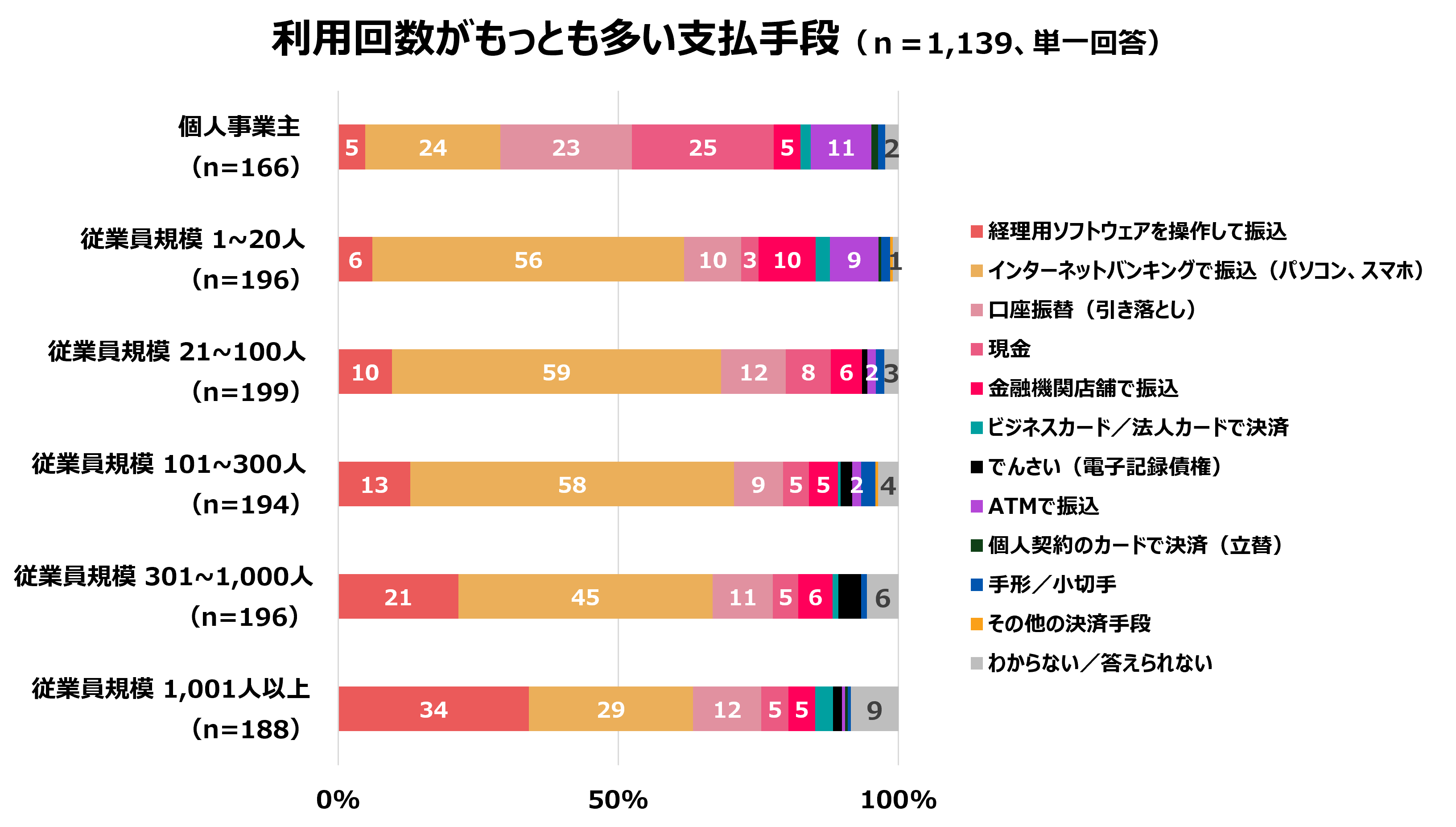 質問「取引先から受け取った請求書に対する支払手段について伺います。利用している手段のうち、利用回数がもっとも多い手段をお選びください。」