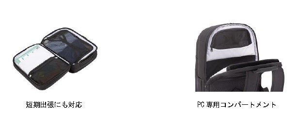 1泊2日程度の短期出張に対応可能な大容量設計のバッグです。PCをすっきり収納可能なPC専用コンパートメントを備えています。フロント部分上下に2つのポケットを配置し、下部ポケットは左右どちらからも素早くアクセスできます。