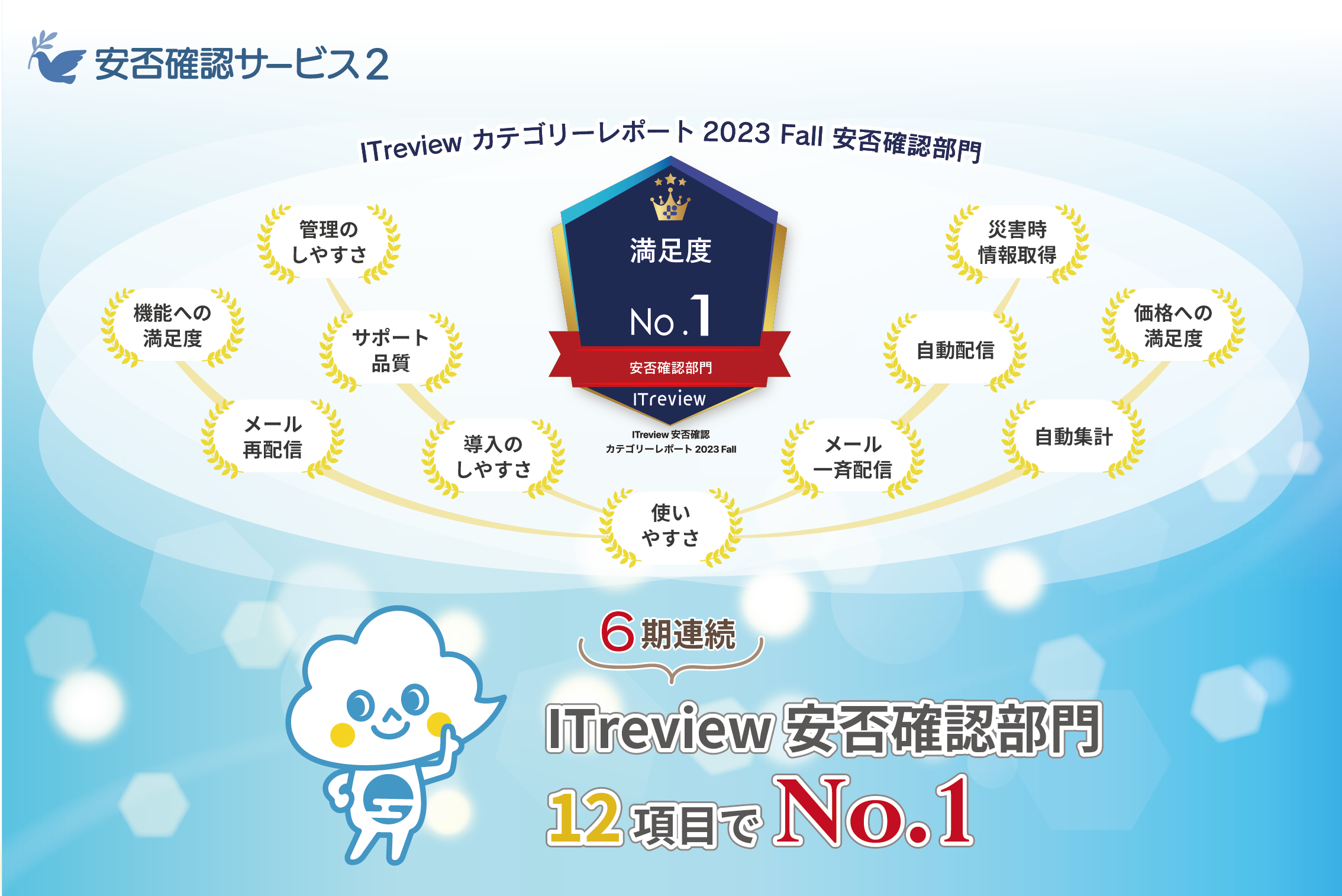 当社「安否確認サービス2」は、安否確認カテゴリの「満足度」「使いやすさ」「管理のしやすさ」など13部門中12部門でNo.1を獲得いたしました。