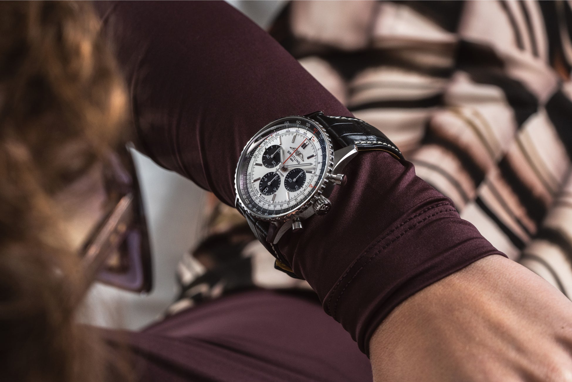 新しいナビタイマーを開発するにあたり、ブライトリングは一番の特徴であるデザインコードを継承しました。遠くから見ても一目でナビタイマーとわかる回転計算尺、バトンインデックス、3つのクロノグラフカウンター、操作しやすい刻み入りのベゼル。それでも、近くで見ると、現代的な洗練を加えたことがはっきりと分かります。