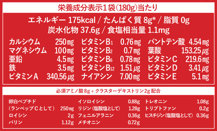 筋合成に必要な必須アミノ酸EAAの含有量が多く含まれたゼリーで、プロテインに比べてタンパク質を4倍速く体に吸収することができるため、運動直前や運動中の摂取で効果を期待できます。また、東証一部上場の先端バイオ医薬品開発企業が研究開発した成分「ランペップ」が運動パフォーマンスを支えます。様々な機能を有しながらも、イギリス・LGC社のアンチドーピング認証プログラム「インフォームドスポーツ」を取得し、年代を問わず安心して摂取いただけます。