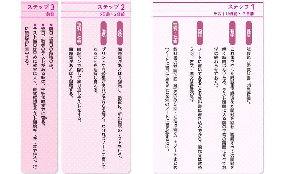 位、学年1位になれました!」「テストの点数が上がりました!」というお礼がたくさん届きました。その後コロナに見舞われ、教育課程も新しくなり、今の中学生にとって新たな悩みが生まれています。昔から変わらない中学生の勉強にとって大切なことに加え、最新の課題に対応するべく、バージョンアップしました。