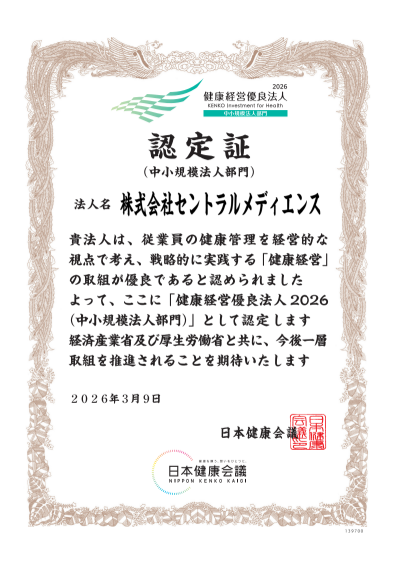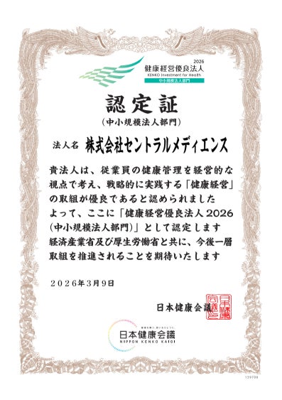 医療従事者のマッチングや医療部材の卸、経営支援等の医療機関のトータルサポート事業を展開する株式会社セントラルメディエンス(本社:東京都港区、代表取締役:中川隆太郎、以下「当社」)は、2026年3月9日付にて、経済産業省および日本健康会議が選定する「健康経営優良法人2026(中小規模法人部門)」に認定されましたことをお知らせいたします。