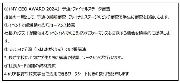 「社長を味わおう」をスローガンに、社長をプロデュースすることで企業を知るきっかけを創り出し、Z世代との交流をおもしろ楽しく演出。印象に残る社長カードやお菓子の「社長チップス!」等をはじめとした独自のプロデュースで、老若男女に愛される企業の入り口づくりを展開。一方で、企業が学校教育に貢献できるようパートナースクールや教育機関との連携も促進。子どもたちの挑戦心を養い、実社会をより具体的にイメージした将来や職業選択を実現できるようきっかけづくりを行う。授業でも使用できる、全国の社長&仕事の教科書「社長カード図鑑」が完成、社長が先生となり学校に出張登壇する「うまCEO学園(うましおがくえん)」を全国の学校にて実施中。アワード後には各地域で企業と学生が集うカンファレンスを開催予定。