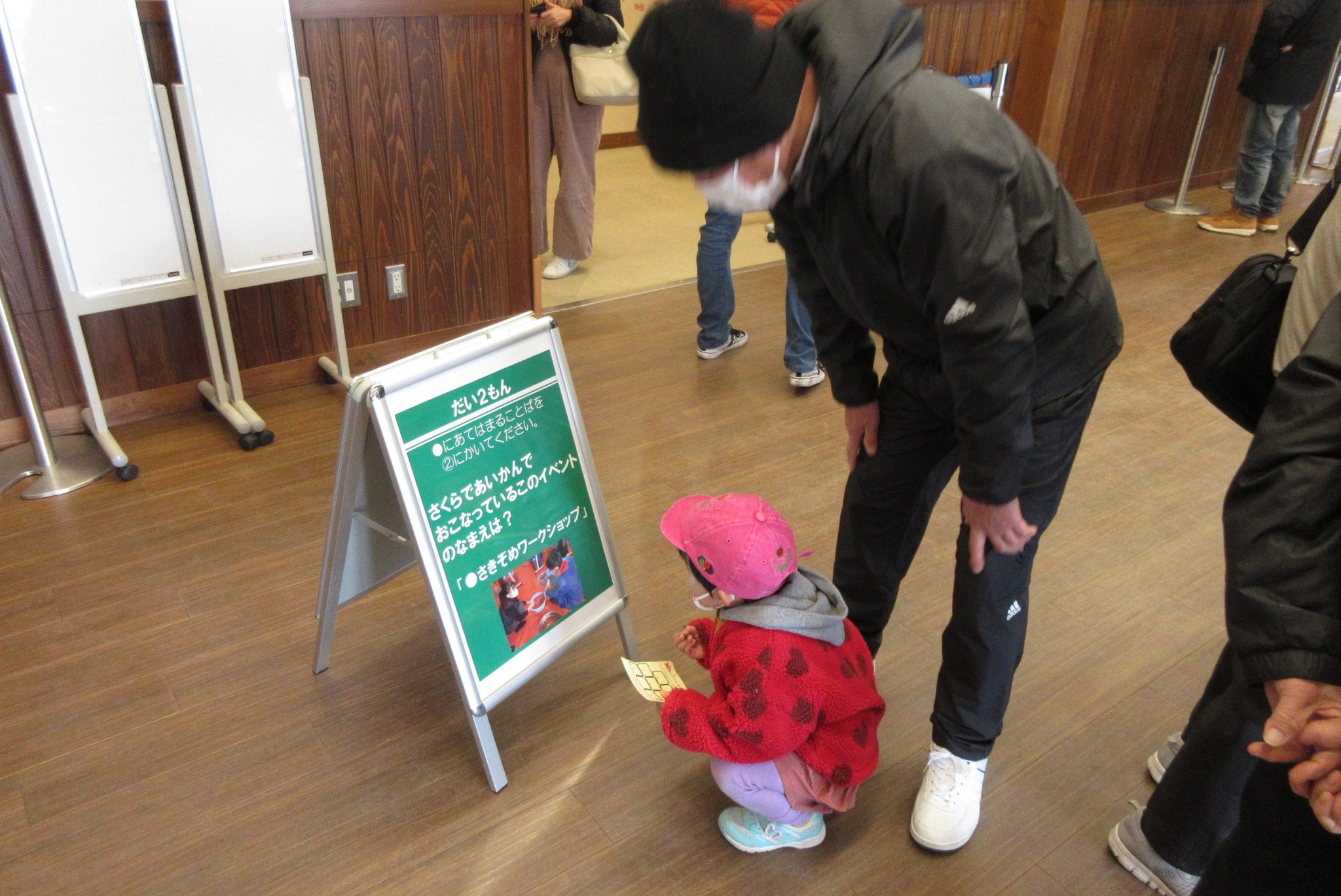 ①さくらであい館の情報発信コーナー及びスタッフルーム前でクイズのプリントをご用意しておりますので、ご自由にお取りください。