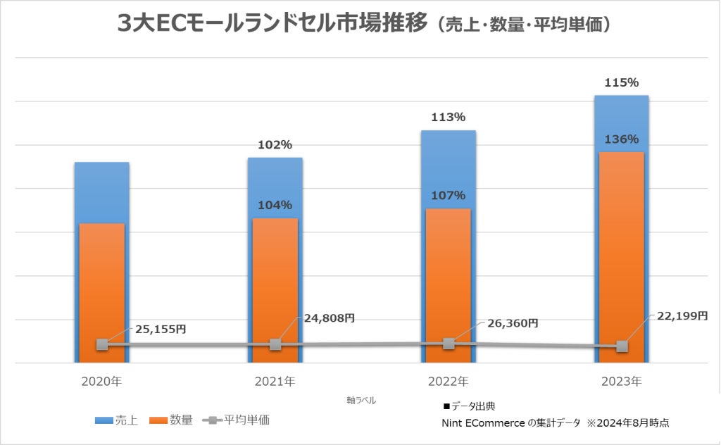 2023年の3大ECモールのランドセル市場は、2022年に比べ平均単価が減少していますが、販売数量が増加し、結果として総売上高は前年を超えています。