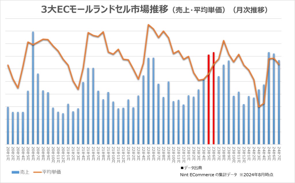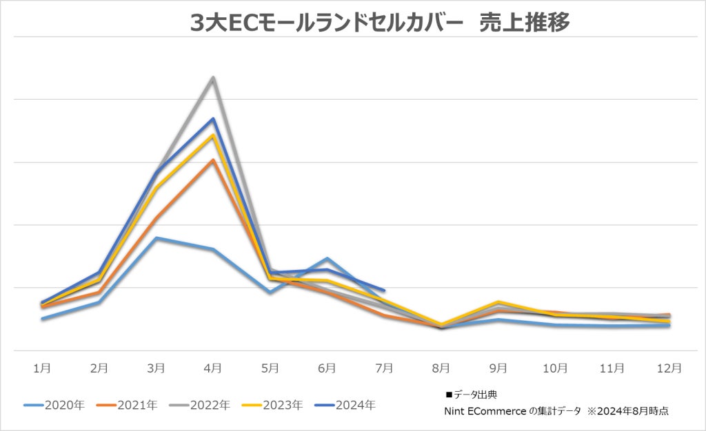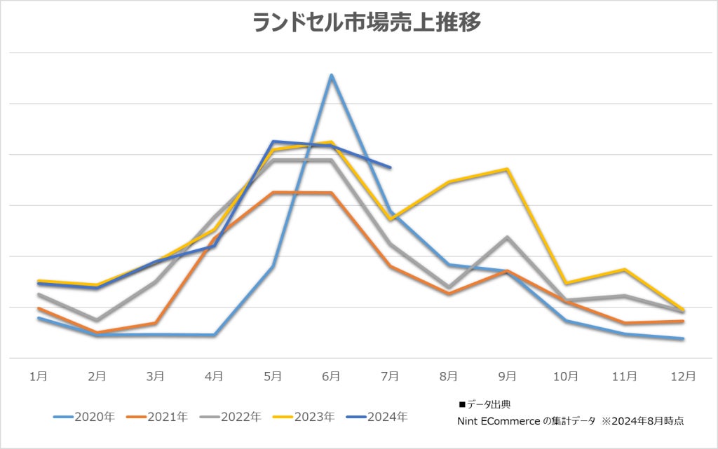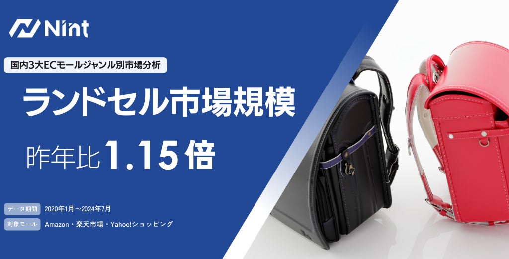 「データの価値、人の可能性が輝く世界」をビジョンに、国内大手ECモールの市場動向データ分析ツール「Nint ECommerce」(https://www.nint.jp/ec/) を提供する株式会社Nint(本社:東京都新宿区、代表取締役:吉野順子 以下、「Nint」)は、2020年1月~2024年7月におけるECモール(楽天市場、Amazon、Yahoo!ショッピングの市場)のランドセル市場について調査いたしましたのでお知らせいたします。