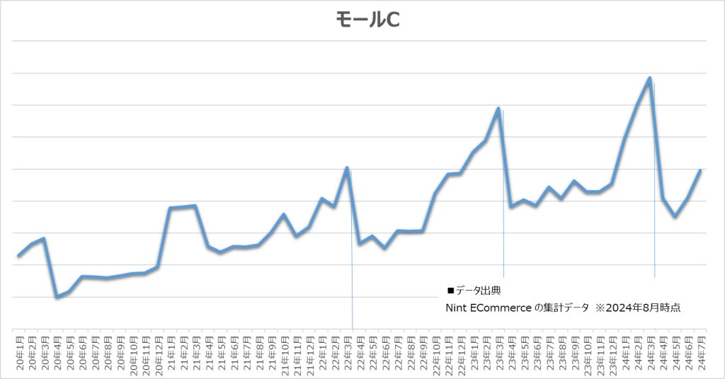 一方モールCでは3月に売上が上昇しています。この傾向は2022年より続いており、2024年も同様の傾向が見られます。4月より進学になるので、「駆け込み需要」なのか、それとも次年度を見据えての「超早期の需要」なのか、モールCで展開する場合は需要の判断がポイントになりそうです。
