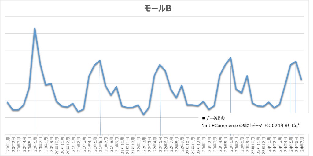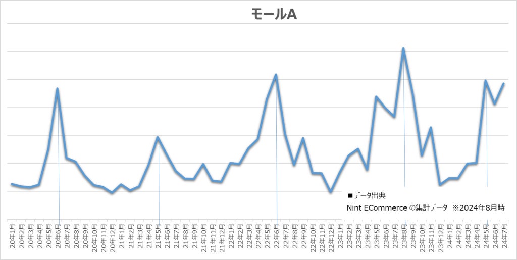 モールA・Bは市場の需要時期に売上が上昇し、Aモールでは2023年8月に、Bモールでは6月に売上が高くなる傾向がみられます。