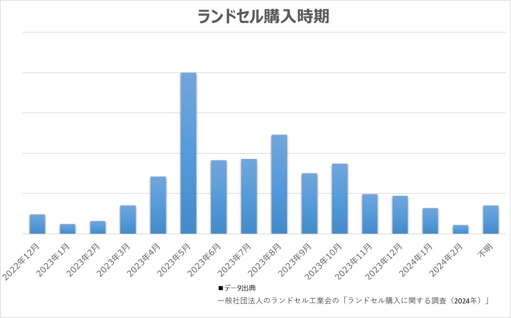 一般社団法人ランドセル工業会の「ランドセル購入に関する調査(2024年)」によると2024年4月に小学校に進学する児童のランドセルを購入した時期は2023年5月が最も高く、次いで8月でした。2024年以前も毎年同様の傾向のため、5月~8月はランドセル市場が盛り上がる季節といえそうです。