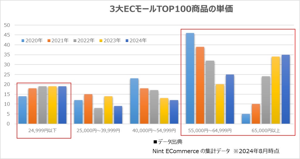 このことから、EC市場で高単価商品が売れていないわけではなく、高単価と低単価の2極化により、単価が下がっているのではないかと思われます。