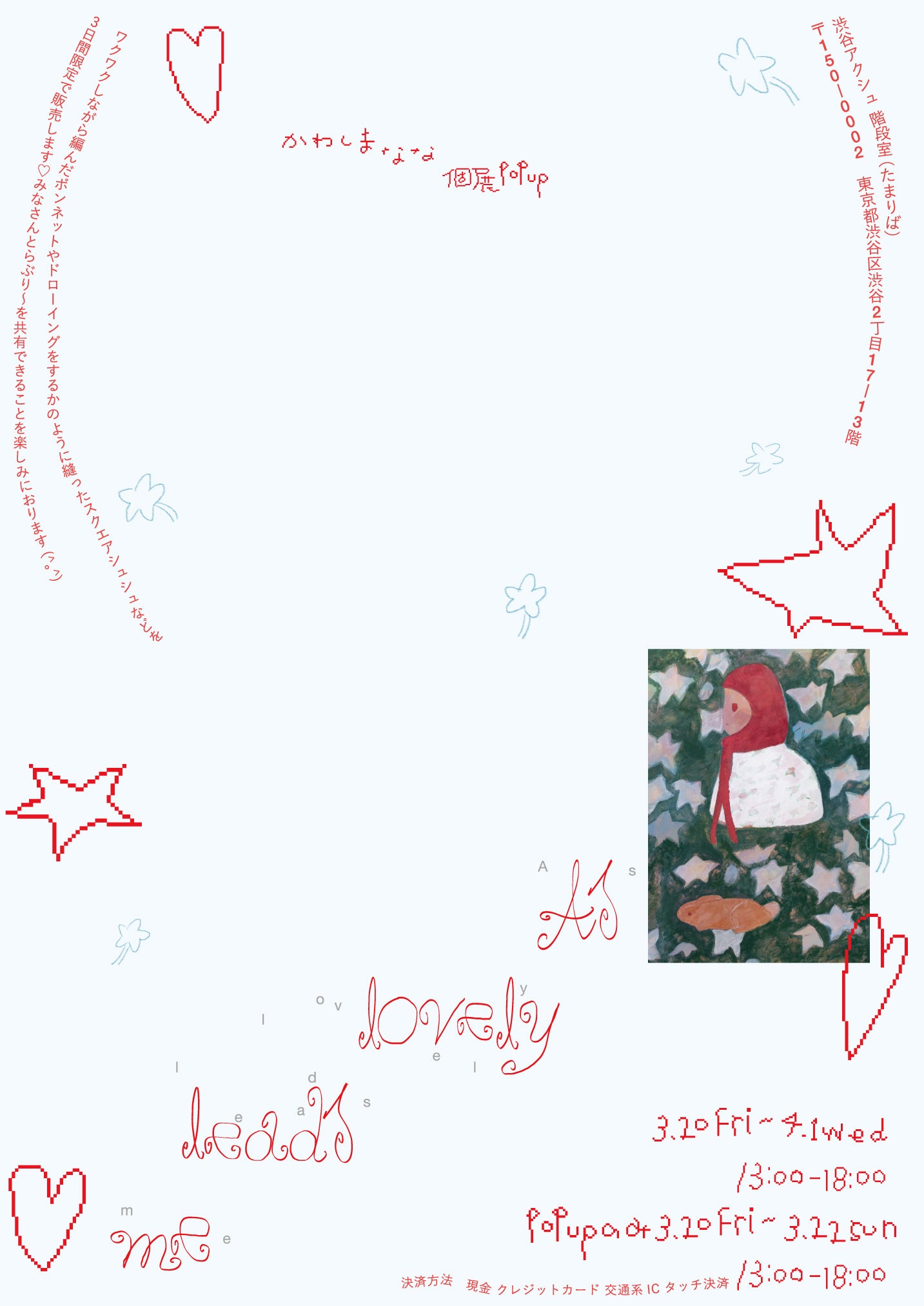 株式会社シアターワークショップ(東京都渋谷区)は、運営・管理をしている渋谷アクシュ3階のユニークなレンタルスペース「階段室(たまりば)」(所在地:東京都渋谷区)にて、河嶋菜々氏による個展popup『As lovely leads me.』を2026年3月20日(金)~4月1日(水)にかけて開催いたします。期間内の3月20日(金)~22日(日)はシュシュや編み物の販売も実施いたします。